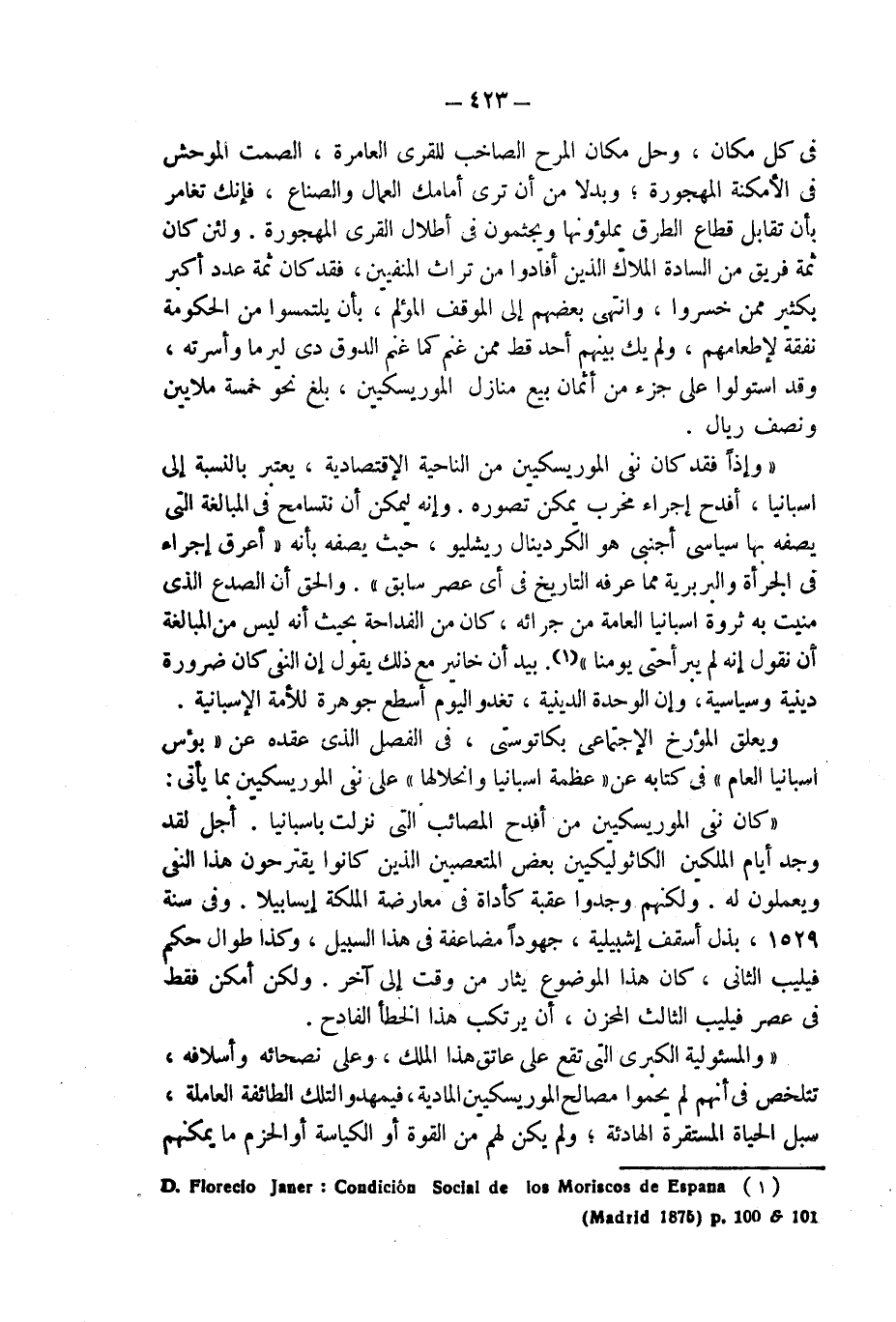"وإذاً فقد كان نفى الموريسكيين من الناحية الإقتصادية، يعتبر بالنسبة إلى اسبانيا، أفدح إجراء مخرب يمكن تصوره. وإنه ليمكن أن نتسامح فى المبالغة التى يصفه بها سياسى أجنبى هو الكردينال ريشليو، حيث يصفه بأنه " أعرق إجراء فى الجرأة والبربرية مما عرفه التاريخ فى أى عصر سابق". والحق أن الصدع الذى منيت به ثروة اسبانيا العامة من جرائه، كان من الفداحة بحيث أنه ليس من المبالغة أن نقول إنه لم يبرأ حتى يومنا" (¬1). بيد أن خانير مع ذلك يقول إن النفى كان ضرورة دينية وسياسية، وإن الوحدة الدينية، تغدو اليوم أسطع جوهرة للأمة الإسبانية.
