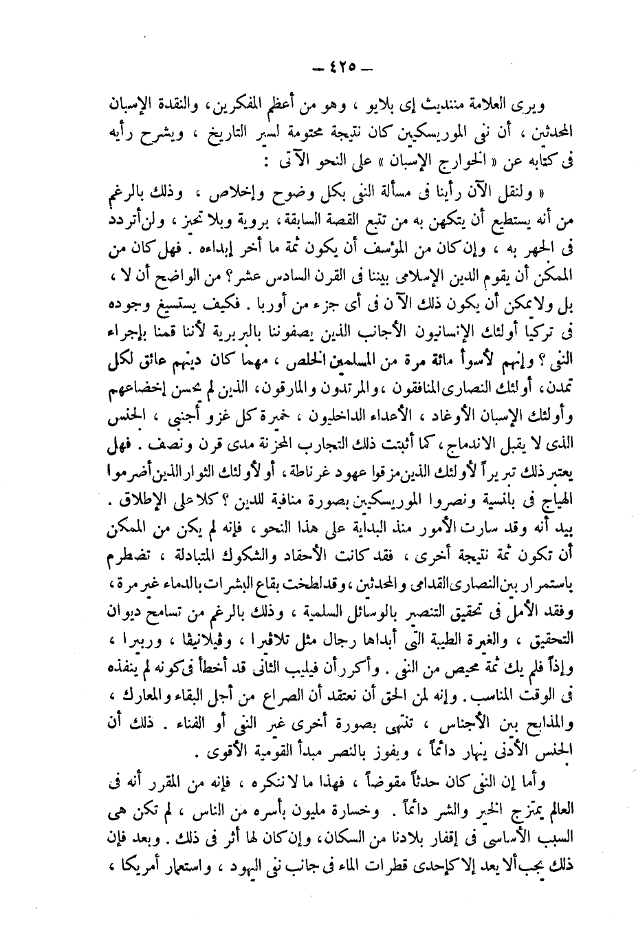"ولنقل الآن رأينا فى مسألة النفى بكل وضوح وإخلاص، وذلك بالرغم من أنه يستطيع أن يتكهن به من تتبع القصة السابقة، بروية وبلا تحيز، ولن أتردد فى الجهر به، وإن كان من المؤسف أن يكون ثمة ما أخر إبداءه. فهل كان من الممكن أن يقوم الدين الإسلامى بيننا فى القرن السادس عشر؟ من الواضح أن لا، بل ولا يمكن أن يكون ذلك الآن فى أى جزء من أوربا. فكيف يستسيغ وجوده فى تركيا أولئك الإنسانيون الأجانب الذين يصفوننا بالبربرية لأننا قمنا بإجراء النفى؟ وإنهم لأسوأ مائة مرة من المسلمين الخلص، مهما كان دينهم عائق لكل تمدن، أولئك النصارى المنافقون، والمرتدون والمارقون، الذين لم يحسن إخضاعهم وأولئك الإسبان الأوغاد، الأعداء الداخليون، خميرة كل غزو أجنبى، الجنس الذى لا يقبل الاندماج، كما أثبتت ذلك التجارب المحزنة مدى قرن ونصف. فهل يعتبر ذلك تبريراً لأولئك الذين مزقوا عهود غرناطة، أو لأولئك الثوار الذين أضرموا الهياج فى بلنسية ونصروا الموريسكيين بصورة منافية للدين؟ كلا على الإطلاق.