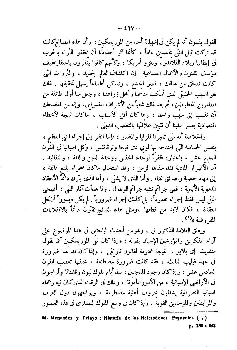 والخلاصة أنه متى تدبرنا المزايا والمضار، فإننا ننظر إلى إجراء النفى العظيم، بنفس الحماسة التى امتدحه بها لوبى دى فيجا وثرفانتس، وكل اسبانيا فى القرن السابع عشر، باعتباره ظفراً لوحدة الجنس ووحدة الدين واللغة، والتقاليد.