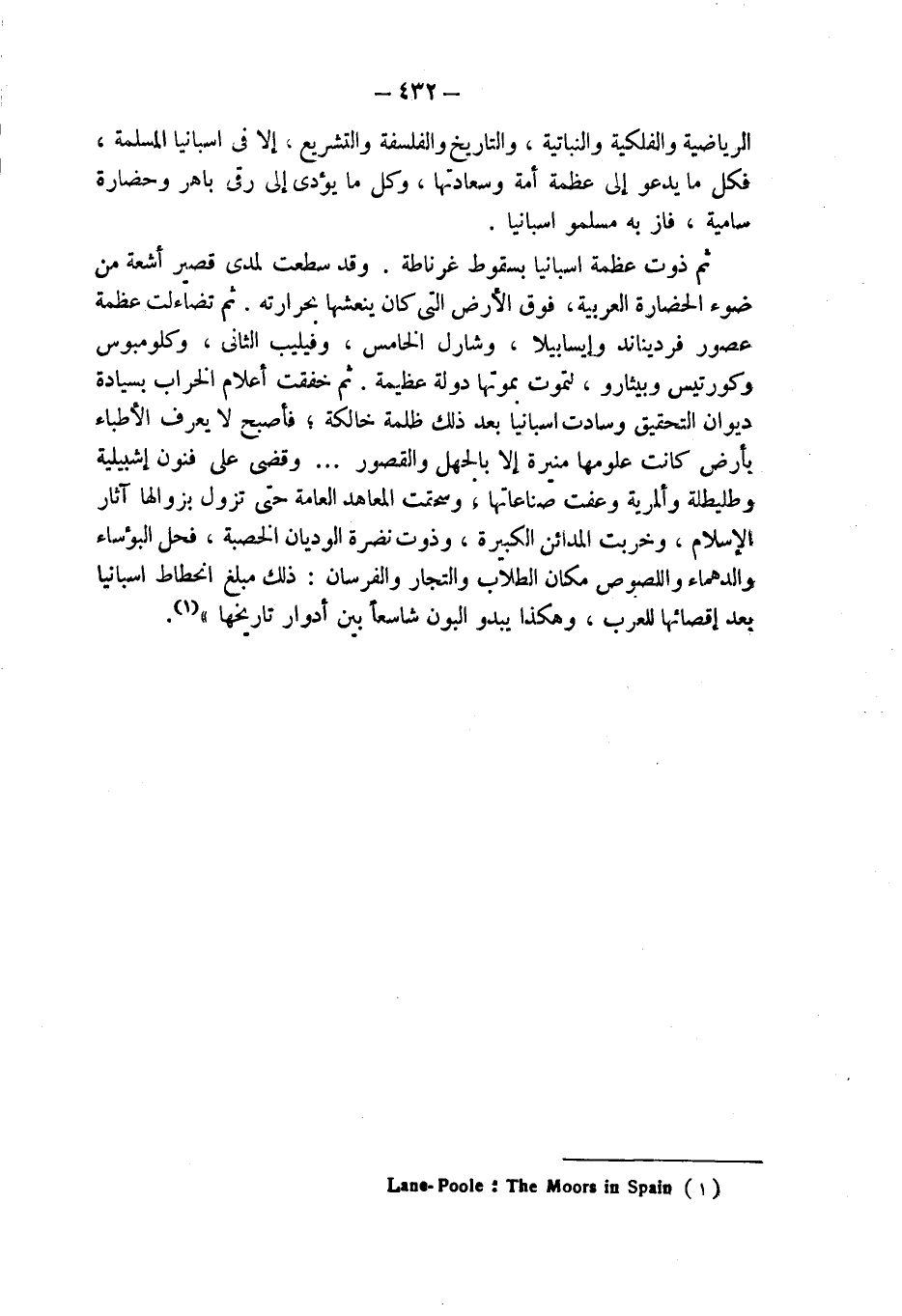 ثم ذوت عظمة اسبانيا بسقوط غرناطة. وقد سطعت لمدى قصير أشعة من ضوء الحضارة العربية، فوق الأرض التى كان ينعشها بحرارته. ثم تضاءلت عظمة عصور فرناندو وإيسابيلا، وشارل الخامس، وفيليب الثانى، وكلومبوس وكورتيس وبيثارو، لتموت بموتها دولة عظيمة. ثم خفقت أعلام الخراب بسيادة ديوان التحقيق وسادت اسبانيا بعد ذلك ظلمة حالكة؛ فأصبح لا يعرف الأطباء بأرض كانت علومها منيرة إلا بالجهل والقصور ... وقضى على فنون إشبيلية وطليطلة وألمرية وعفت صناعاتها؛ وسحقت المعاهد العامة حتى تزول بزوالها آثار الإسلام، وخربت المدائن الكبيرة، وذوت نضرة الوديان الخصبة، فحل البؤساء والدهماء واللصوص مكان الطلاب والتجار والفرسان: ذلك مبلغ انحطاط اسبانيا يعد إقصائها للعرب، وهكذا يبدو البون شاسعاً بين أدوار تاريخها" (¬1).