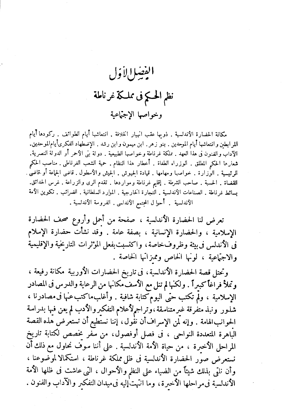 وتحتل قصة الحضارة الأندلسية، فى تاريخ الحضارات الأوربية مكانة رفيعة، وتملأ فراغا كبيراً. ولكنها لم تنل مع الأسف مكانها من الرعاية والدرس فى المصادر الإسلامية، ولم تكتب حتى اليوم كتابة شافية. وأغلب ما كتب عنها فى مصادرنا، شذور ونبذ متفرقة غير متناسقة، وتراجم لأعلام التفكير والأدب لم يعن فيها بدراسة الجوانب الهامة. وإنه لمن الإسراف أن نقول، إننا نستطيع أن نستعرض هذه القصة الباهرة المتعددة النواحى، فى فصل أو فصول، من سفر يخصص لكتابة تاريخ المراحل الأخيرة، من حياة الأمة الأندلسية. على أننا سوف نحاول مع ذلك أن نستعرض صور الحضارة الأندلسية فى ظل مملكة غرناطة، استكمالا لموضوعنا، وأن نلقى بذلك شيئاً من الضياء على النظم والأحوال، التى عاشت فى ظلها الأمة الأندلسية فى مراحلها الأخيرة، وما انتهت إليه فى ميدان التفكير والآداب والفنون