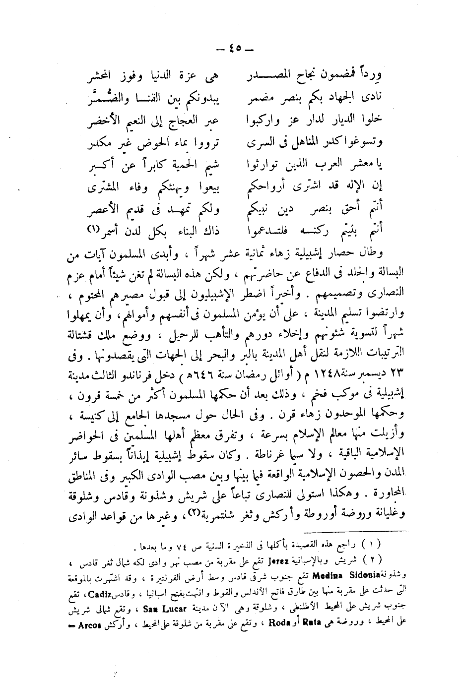 (¬2) شريش وبالإسبانية Jerez تقع على مقربة من مصب نهر وادى لكه شمال ثغر قادس، وشذونة Medina Sidonia تقع جنوب شرقى قادس وسط أرض الفرنتيرة، وقد اشتهرت بالموقعة التى حدثت على مقربة منها بين طارق فاتح الأندلس والقوط وانتهت بفتح اسبانيا، وقادس Cadiz، تقع جنوب شريش على المحيط الأطلنطى، وشلوقة وهى الآن مدينة San Lunar، وتقع شمالى شريش على المحيط، وروضة هى Ruta أو Roda، وتقع على مقربة من شلوقة على المحيط، وأركش Arcos =