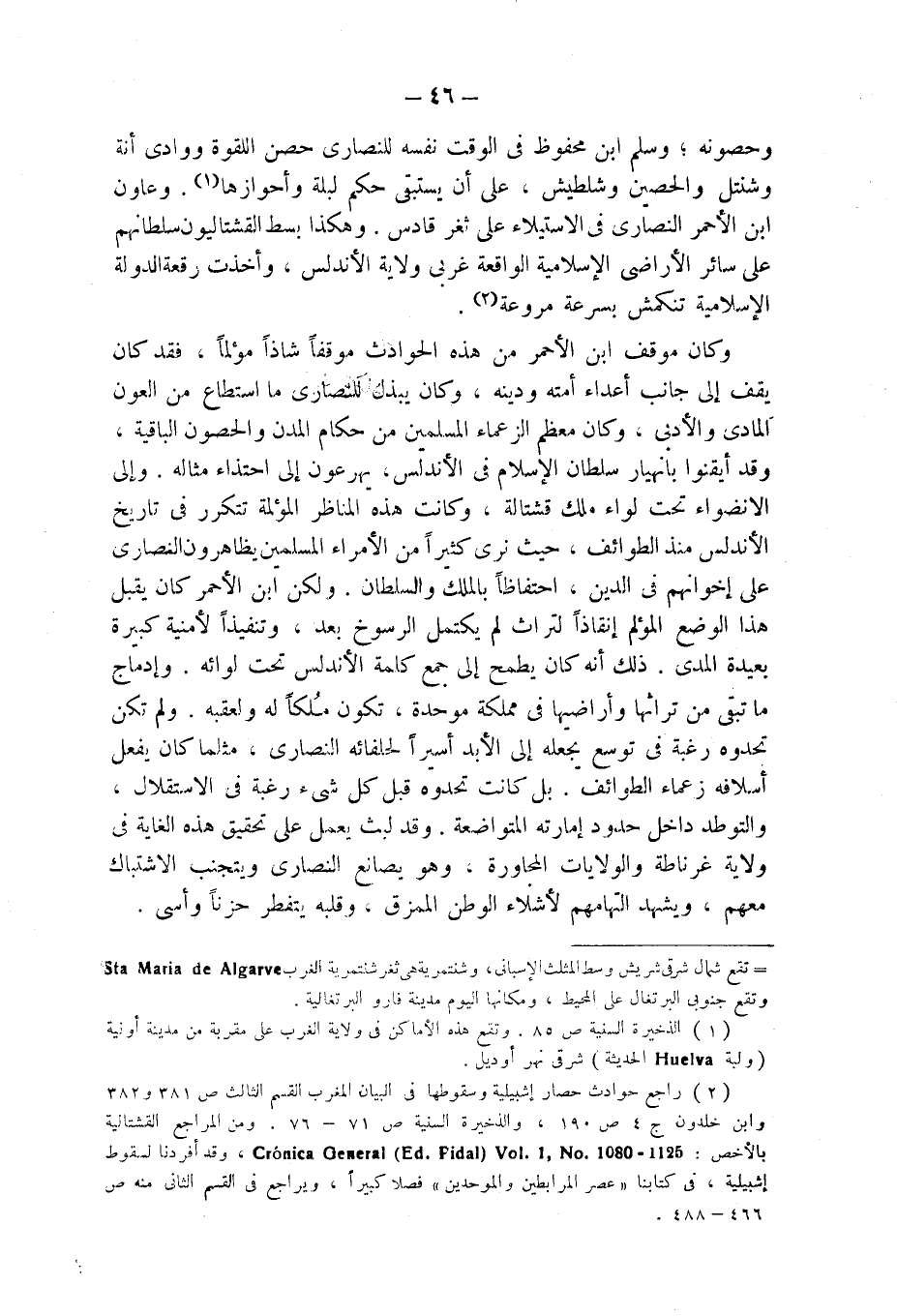 (¬2) راجع حوادث حصار إشبيلية وسقوطها فى البيان المغرب القسم الثالث ص 381 و 382 وابن خلدون ج 4 ص 190، والذخيرة السنية ص 71 - 76، ومن المراجع القشتالية بالأخص: Cronica General (Ed. Pidal) Vol. I, No. 1080 - 1125، وقد أفردنا لسقوط إشبيلية، فى كتابنا " عصر المرابطين والموحدين " فصلا كبيراً، ويراجع فى القسم الثانى منه ص 466 - 488.
