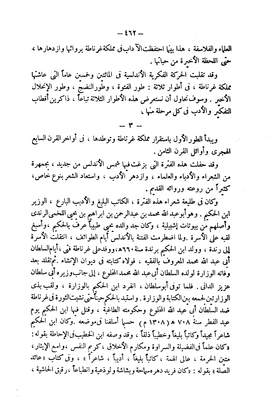 وقد تقلبت الحركة الفكرية الأندلسية فى المائتين وخمسين عاماً التى عاشتها مملكة غرناطة، فى أطوار ثلاثة: طور الفتوة، وطور النضج، وطور الإنحلال الأخير. وسوف نحاول أن نستعرض هذه الأطوار الثلاثة تباعاً، ذاكرين أقطاب التفكير والأدب فى كل مرحلة منها.