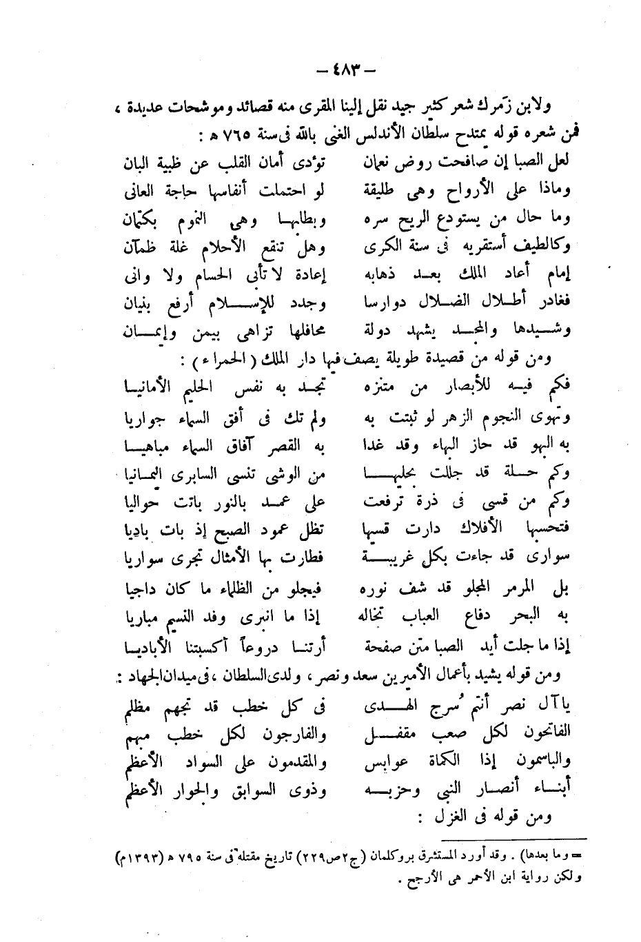 = وما بعدها). وقد أورد المستشرق بروكلمان (ج 2 ص 229) تاريخ مقتله فى سنة 795 هـ (1393 م) ُولكن رواية ابن الأحمر هى الأرجح