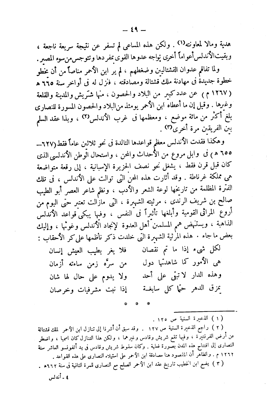 (¬2) راجع الذخيرة السنية ص 127. وقد سبق أن أشرنا إلى تنازل ابن الأحمر لملك قشتالة عن أرض الفرنتيرة، وفيها تقع شريش وقادس وغيرها، ولكن هذا التنازل كان اسميا، واضطر النصارى إلى افتتاح هذه المدن بصورة فعلية. وكان سقوط شريش وقادس فى يد ألفونسو العاشر سنة 1262 م. والظاهر أن المقصود هنا مصادقة ابن الأحمر على استيلاء النصارى على هذه القواعد.