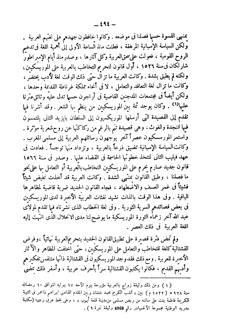 بمنتهى القسوة حسبما فصلنا فى موضعه. وكانوا يحافظون جهدهم على لغتهم العربية. ولكن السياسة الإسبانية المرهقة، فطنت منذ الساعة الأولى إلى أهمية اللغة فى تدعيم الروح القومية، فعولت على سحق العربية وكل آثارها، وصدر منذ أيام الإمبراطور شارلكان فى سنة 1526، أول قانون لتحريم التخاطب بالعربية على الموريسكيين، ولكنه لم يطبق بشدة. وكانت العربية ما تزال حتى ذلك الوقت لغة لأدب يحتضر، وكانت ما تزال لغة التعاقد والتعامل، لا فى أنحاء مملكة غرناطة القديمة وحدها، ولكن أيضاً فى مجتمعات المدجنين القاصية فى أراجون حسبما تدل عليه وثائق عثرنا عليها (¬1). وكان يوجد ثمة بين الموريسكيين من ينظم بها الشعر. وقد أشرنا فيما تقدم إلى القصيدة التى أرسلها الموريسكيون إلى السلطان بايزيد الثانى يلتمسون فيها النجدة والغوث، وهى قصيدة تنم بالرغم من ركاكتها عن روح شعرية مؤثرة. واستمر الموريسكيون عصراً آخر يوجهون رسائلهم العربية إلى مسلمى المغرب.