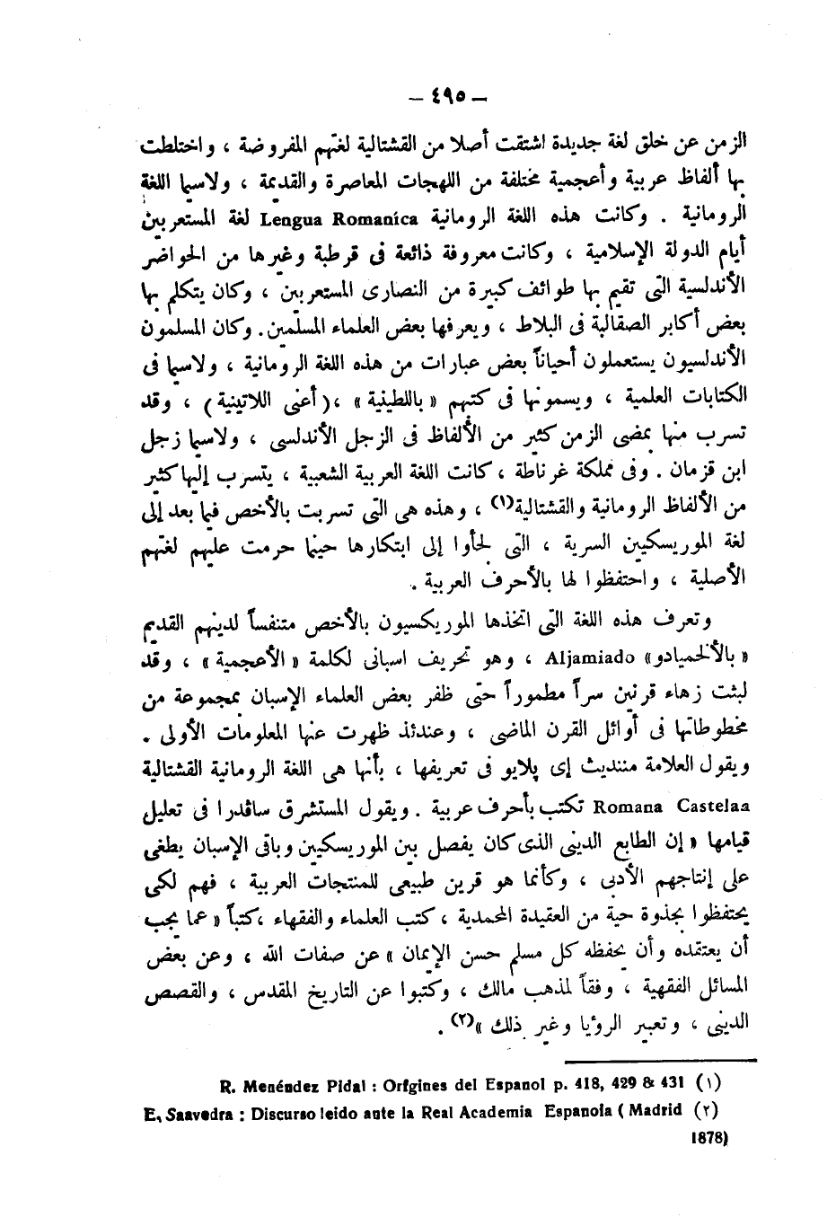 الزمن عن خلق لغة جديدة اشتقت أصلا من القشتالية لغتهم المفروضة، واختلطت بها ألفاظ عربية وأعجمية مختلفة من اللهجات المعاصرة والقديمة، ولاسيما اللغة الرومانية. وكانت هذه اللغة الرومانية Lengua Romanica لغة المستعربين أيام الدولة الإسلامية، وكانت معروفة ذائعة فى قرطبة وغيرها من الحواضر الأندلسية التى تقيم بها طوائف كبيرة من النصارى المستعربين، وكان يتكلم بها بعض أكابر الصقالبة فى البلاط، ويعرفها بعض العلماء المسلمين. وكان المسلمون الأندلسيون، يستعملون أحياناً بعض عبارات من هذه اللغة الرومانية، ولاسيما فى الكتابات العلمية، ويسمونها فى كتبهم "باللطينية"، (أعنى اللاتينية)، وقد تسرب منها بمضى الزمن كثير من الألفاظ فى الزجل الأندلسى، ولاسيما زجل ابن قزمان. وفى مملكة غرناطة، كانت اللغة العربية الشعبية، يتسرب إليها كثير من الألفاظ الرومانية والقشتالية (¬1)، وهذه هى التى تسربت بالأخص فيما بعد إلى لغة الموريسكيين السرية، التى لجأوا إلى ابتكارها حينما حرمت عليهم لغتهم الأصلية، واحتفظوا لها بالأحرف العربية.