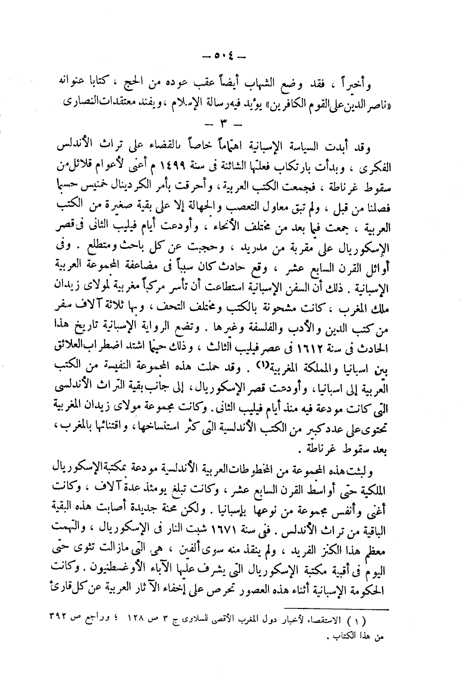 وقد أبدت السياسة الإسبانية اهتماماً خاصاً بالقضاء على تراث الأندلس الفكرى، وبدأت بارتكاب فعلتها الشائنة فى سنة 1499 م أعنى لأعوام قلائل من سقوط غرناطة، فجمعت الكتب العربية، وأحرقت بأمر الكردينال خمنيس حسبما فصلنا من قبل، ولم تبق معاول التعصب والجهالة إلا على بقية صغيرة من الكتب العربية، جمعت فيما بعد من مختلف الأنحاء، وأودعت أيام فيليب الثانى فى قصر الإسكوريال على مقربة من مدريد، وحجبت عن كل باحث ومتطلع. وفى أوائل القرن السابع عشر، وقع حادث كان سبباً فى مضاعفة المجموعة العربية الإسبانية. ذلك أن السفن الإسبانية استطاعت أن تأسر مركباً مغربية لمولاى زيدان ملك المغرب "كانت مشحونة بالكتب ومختلف التحف، وبها ثلاثة آلاف سفر من كتب الدين والأدب والفلسفة وغيرها. وتضع الرواية الإسبانية تاريخ هذا الحادث فى سنة 1612 فى عصر فيليب الثالث، وذلك حينما اشتد اضطراب العلائق بين اسبانيا والمملكة المغربية (¬1). وقد حملت هذه المجموعة النفيسة من الكتب العربية إلى اسبانيا، وأودعت قصر الإسكوريال، إلى جانب بقية التراث الأندلسى التى كانت مودعة فيه منذ أيام فيليب الثانى. وكانت مجموعة مولاى زيدان المغربية تحتوى عدد كبير من الكتب الأندلسية التى كثر استنساخها، "اقتنائها بالمغرب، بعد سقوط غرناطة.