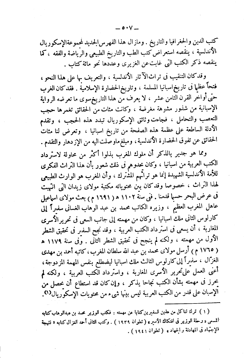 ومما هو جدير بالذكر أن ملوك المغرب بذلوا أكثر من محاولة لاسترداد الكتب العربية من اسبانيا، وكان يحدوهم فى ذلك شعور بأن هذا التراث الفكرى للأمة الأندلسية الشهيدة إنما هو تراثهم المشترك، وأن المغرب هو الوارث الطبيعى لهذا التراث، خصوصا وقد كان بين محتوياته مكتبة مولاى زيدان التى انتهبت فى عرض البحر حسبما قدمنا. ففى سنة 1102 هـ (1691 م) بعث مولاى اسماعيل عاهل المغرب العظيم، وزيره الكاتب محمد بن عبد الوهاب الغسانى سفيراً إلى كارلوس الثانى ملك اسبانيا، وكان من مهمته إلى جانب السعى فى تحرير الأسرى المغاربة، أن يسعى فى استرداد الكتب العربية، وقد نجح السفير فى تحقيق الشطر الأول من مهمته، ولكنه لم ينجح فى تحقيق الشطر الثانى. وفى سنة 1179 هـ (1765 م) أرسل مولاى محمد بن عبد الله سلطان المغرب، كاتبه أحمد بن مهدى الغزّال، سفيراً إلى كارلوس الثالث ملك اسبانيا ليضطلع بنفس المهمة المزدوجة، أعنى العمل على تحرير الأسرى المغاربة، واسترداد الكتب العربية، ولكنه لم يحرز فى مهمته بشأن الكتب نجاحا يذكر، وإن كان قد استطاع أن يحصل من الإسبان على قدر من الكتب العربية ليس بينها شىء من محتويات الإسكوريال (¬1).
