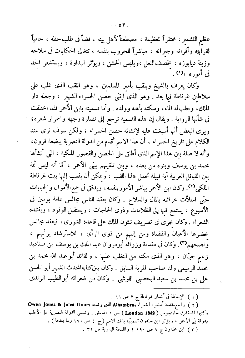 (¬2) راجع مقدمة أطلس " الحمراء " Alhambra الذى وضعه Owen Jones & Jules Goury وكتبها المستشرق جاينجوس ( London 1842) ص 5 الهامش. وتسمى الدولة النصرية على الأغلب بدولة بنى الأحمر، ويؤثر ابن خلدون تسميتها بذلك الاسم (ج 4 ص 170 وما بعدها).