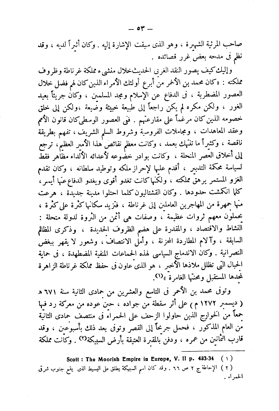 وإليك كيف يصور النقد الغربى الحديث خلال منشىء مملكة غرناطة وظروف مملكته: "كان محمد بن الأحمر من أبرع أولئك الأمراء الذين كان لهم فضل خلال العصور المضطربة، فى الدفاع عن الإسلام ومجد المسلمين، وكان جريئاً بعيد الغور، ولكن مكره لم يكن راجعاً إلى طبيعة خبيثة وضيعة، ولكن إلى خلق خصومه الذين كان مرغماً على مقارعتهم. ففى العصور الوسطى كان قانون الأمم وعقد المعاهدات، ومجاملات الفروسية وشروط السلم الشريف، تفهم بطريقة ناقصة، وكثيراً ما تنتهك بعمد، وكانت معظم نقائص هذا الأمير العظيم، ترجع إلى أخلاق العصر المنحلة، وكانت بوادر خضوعه لأعدائه الألداء مظاهر فقط لسياسة محكمة التدبير، أقدم عليها لإحراز ملكه وتوطيد سلطانه، وكان تقدم الغزو المستمر يرهق مملكته، ولكنها كانت تغدو أقوى ويغدو الدفاع عنها أيسر، كلما انكمشت حدودها. وكان القشتاليون كلما احتلوا مدينة جديدة، هرعت منها جمهرة من المهاجرين العاملين إلى غرناطة، فتزيد سكانها كثرة على كثرة، يحملون معهم ثروات عظيمة، وصفات هى أثمن من الثروة لدولة منحلة: النشاط والاقتصاد، والمقدرة على هضم الظروف الجديدة، وذكرى المظالم السابقة، وآلام المطاردة المحزنة، وأمل الانتصاف، وشعور لا يقهر ببغض النصرانية. وكان الاندماج السياسى لهذه الجماعات المنفية المضطهدة، فى حماية الجبال التى تظلل ملاذها الأخير، هو الذى عاون فى حفظ مملكة غرناطة الزاهرة لمجدها المستقبل ومحنتها الغامرة " (¬1).