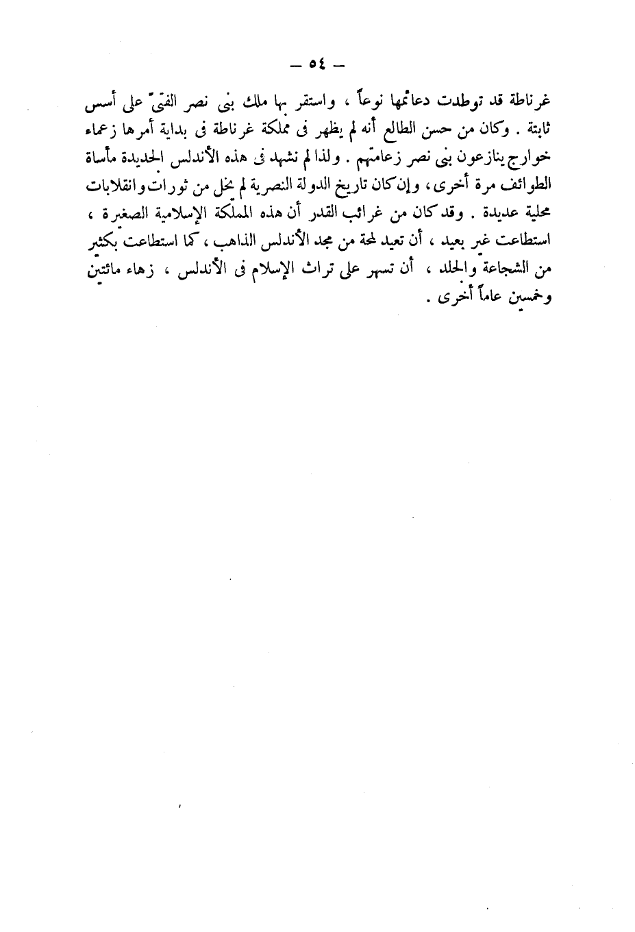 غرناطة قد توطدت دعائمها نوعاً، واستقر بها ملك بنى نصر الفتىّ على أسس ثابتة. وكان من حسن الطالع أنه لم يظهر فى مملكة غرناطة فى بداية أمرها زعماء خوارج ينازعون بنى نصر زعامتهم. ولذا لم نشهد فى هذه الأندلس الجديدة مأساة الطوائف مرة أخرى، وإن كان تاريخ الدولة النصرية لم يخل من ثورات وانقلابات محلية عديدة. وقد كان من غرائب القدر أن هذه المملكة الإسلامية الصغيرة، استطاعت غير بعيد، أن تعيد لمحة من مجد الأندلس الذاهب، كما استطاعت بكثير من الشجاعة والجلد، أن تسهر على تراث الإسلام فى الأندلس، زهاء مائتين وخمسين عاماً أخرى.