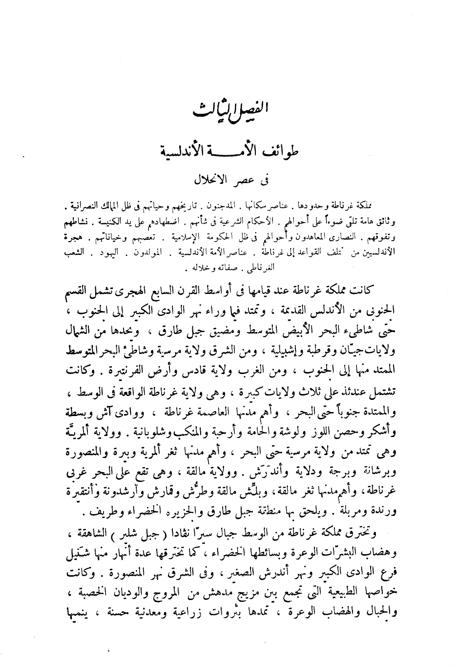 مملكة غرناطة وحدودها. عناصر سكانها. المدجنون. تاريخهم وحياتهم فى ظل الممالك النصرانية. وثائق هامة تلقى ضوءاً على أحوالهم. الأحكام الشرعية فى شأنهم. اضطهادهم على يد الكنيسة. نشاطهم وتفوقهم. النصارى المعاهدون وأحوالهم فى ظل الحكومة الإسلامية. تعصبهم وخياناتهم. هجرة الأندلسيين من مختلف القواعد إلى غرناطة. عناصر الأمة الأندلسية. المولدون. اليهود. الشعب الغرناطى. صفاته وخلاله.