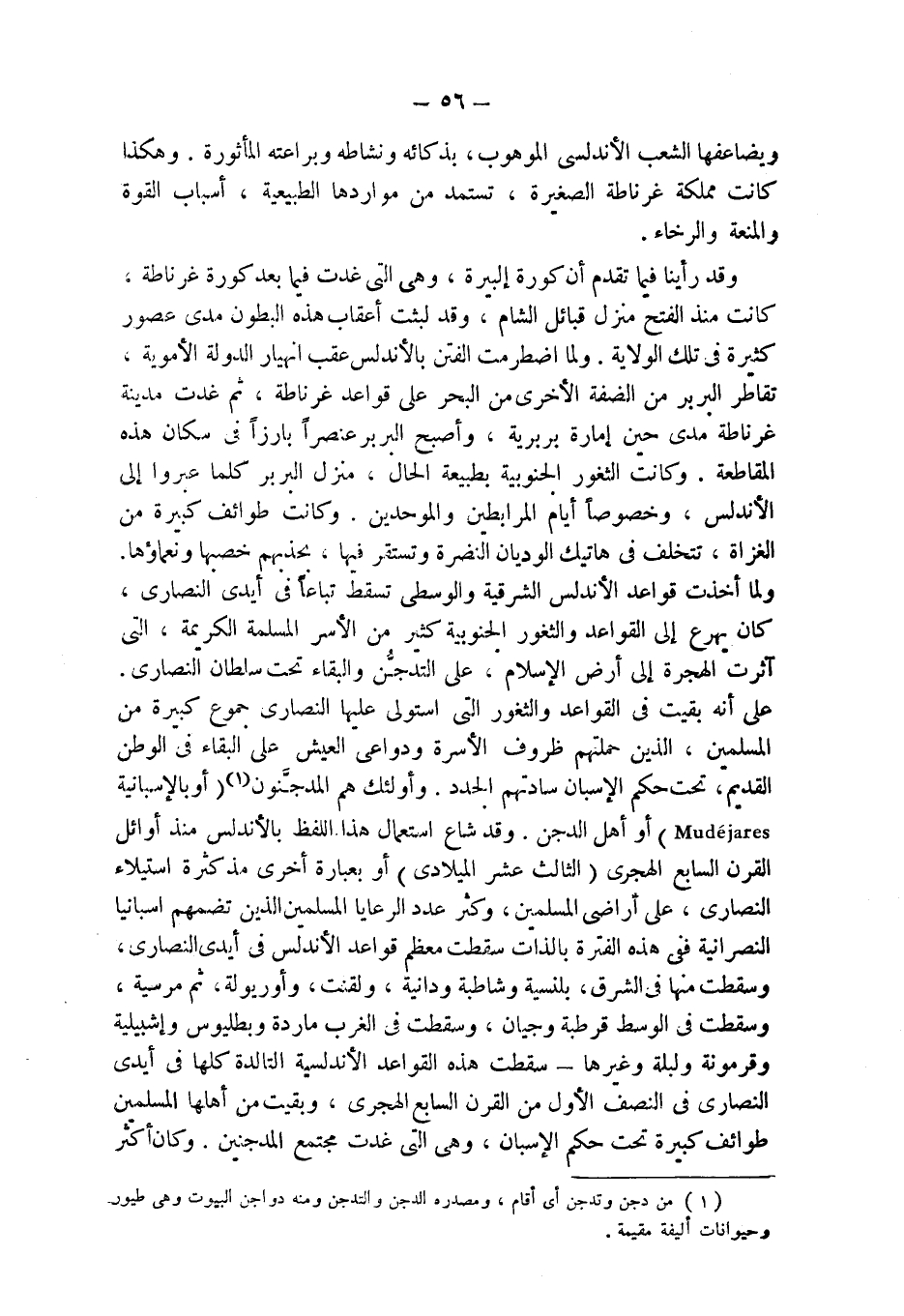 وقد رأينا فيما تقدم أن كورة إلبيرة، وهى التى غدت فيما بعد كورة غرناطة، كانت منذ الفتح منزل قبائل الشام، وقد لبثت أعقاب هذه البطون مدى عصور كثيرة فى تلك الولاية. ولما اضطرمت الفتن بالأندلس عقب انهيار الدولة الأموية، تقاطر البربر من الضفة الأخرى من البحر على قواعد غرناطة، ثم غدت مدينة غرناطة مدى حين إمارة بربرية، وأصبح البربر عنصراً بارزاً فى سكان هذه المقاطعة. وكانت الثغور الجنوبية بطبيعة الحال، منزل البربر كلما عبروا إلى الأندلس، وخصوصاً أيام المرابطين والموحدين. وكانت طوائف كبيرة من الغزاة، تتخلف فى هاتيك الوديان النضرة وتستقر فيها، يجذبهم خصبها ونعماؤها. ولما أخذت قواعد الأندلس الشرقية والوسطى تسقط تباعاً فى أيدى النصارى، كان يهرع إلى القواعد والثغور الجنوبية كثير من الأسر المسلمة الكريمة، التى آثرت الهجرة إلى أرض الإسلام، على التّدجُّن والبقاء تحت سلطان النصارى. على أنه بقيت فى القواعد والثغور التى استولى عليها النصارى جموع كبيرة من المسلمين، الذين حملتهم ظروف الأسرة ودواعى العيش على البقاء فى الوطن القديم، تحت حكم الإسبان سادتهم الجدد. وأولئك هم المدجَّنون (¬1) (أو بالإسبانية Mudéjares) أو أهل الدجن. وقد شاع استعمال هذا اللفظ بالأندلس منذ أوائل القرن السابع الهجرى (الثالث عشر الميلادى) أو بعبارة أخرى مذ كثر استيلاء النصارى، على أراضى المسلمين، وكثر عدد الرعايا المسلمين الذين تضمهم اسبانيا النصرانية ففى هذه الفترة بالذات سقطت معظم قواعد الأندلس فى أيدى النصارى، وسقطت منها فى الشرق، بلنسية وشاطبة ودانية، ولقنت، وأوريولة، ثم مرسية، وسقطت فى الوسط قرطبة وجيان، وسقطت فى الغرب ماردة وبطليوس وإشبيلية وقرمونة ولبلة وغيرها - سقطت هذه القواعد الأندلسية التالدة كلها فى أيدى النصارى فى النصف الأول من القرن السابع الهجرى، وبقيت من أهلها المسلمين طوائف كبيرة تحت حكم الإسبان، وهى التى غدت مجتمع المدجنين. وكان أكثر