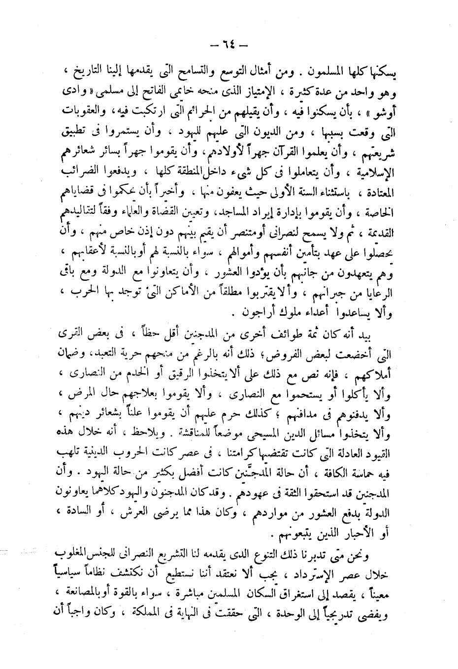 يسكنها كلها المسلمون. ومن أمثال التوسع والتسامح التى يقدمها إلينا التاريخ، وهو واحد من عدة كثيرة، الإمتياز الذى منحه خايمى الفاتح إلى مسلمى "وادى أوشو"، بأن يسكنوا فيه، وأن يقيلهم من الجرائم التى ارتكبت فيه، والعقوبات التى وقعت بسببها، ومن الديون التى عليهم لليهود، وأن يستمروا فى تطبيق شريعتهم، وأن يعلموا القرآن جهراً لأولادهم، وأن يقوموا جهراً بسائر شعائرهم الإسلامية، وأن يتعاملوا فى كل شىء داخل المنطقة كلها، ويدفعوا الضرائب المعتادة، باستثناء السنة الأولى حيث يعفون منها، وأخيراً بأن يحكموا فى قضاياهم الخاصة، وأن يقوموا بإدارة إيراد المساجد، وتعيين القضاة والعلماء وفقاً لتقاليدهم القديمة، ثم ولا يسمح لنصرانى أو متنصر أن يقيم بينهم دون إذن خاص منهم، وأن يحصلوا على عهد بتأمين أنفسهم وأموالهم، سواء بالنسبة لهم أو بالنسبة لأعقابهم، وهم يتعهدون من جانبهم بأن يؤدوا العشور، وأن يتعاونوا مع الدولة ومع باقى الرعايا من جيرانهم، وألا يقتربوا مطلقاً من الأماكن التى توجد بها الحرب، وألا يساعدوا أعداء ملوك أراجون.