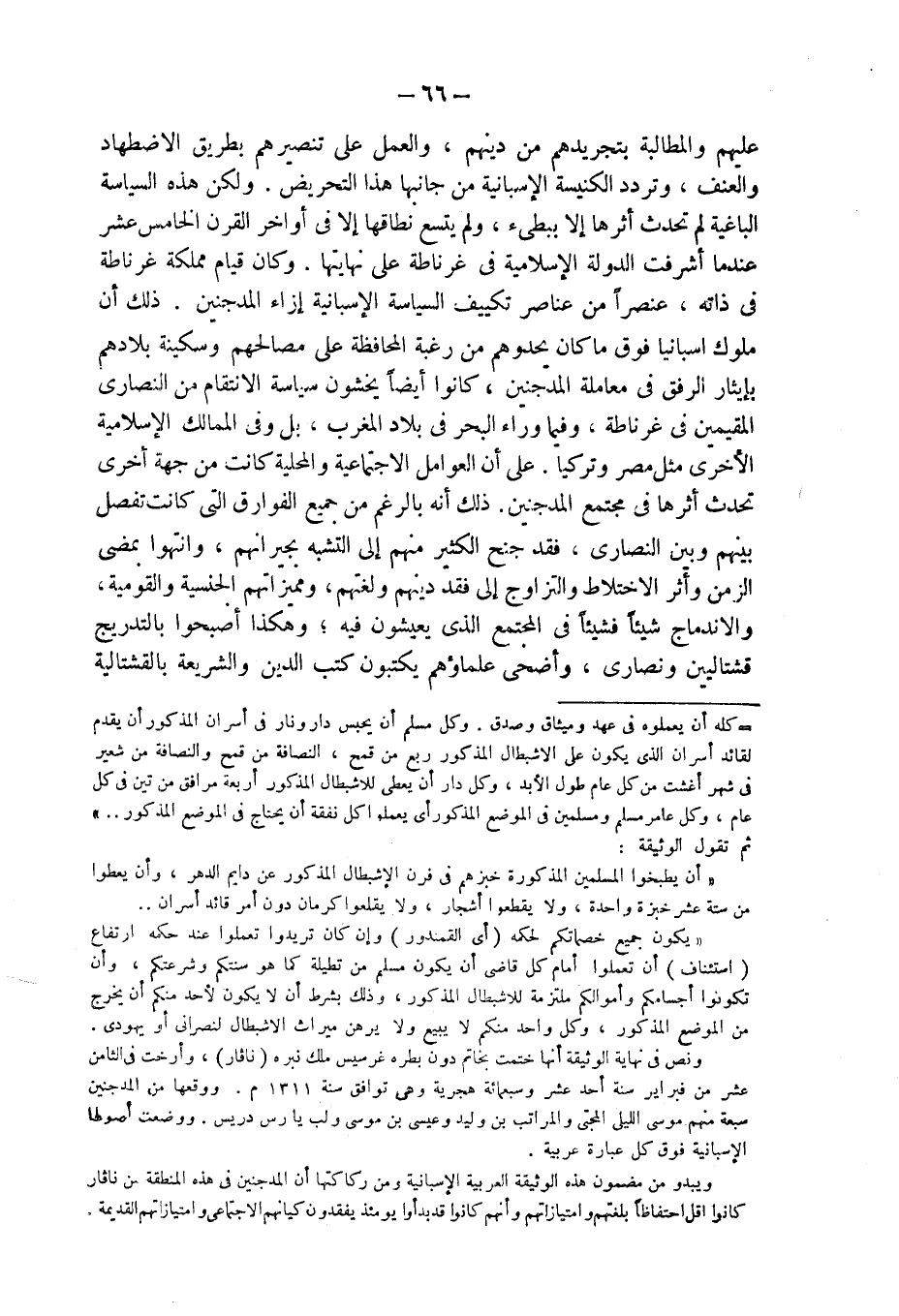 عليهم والمطالبة بتجريدهم من دينهم، والعمل على تنصيرهم بطريق الاضطهاد والعنف، وتردد الكنيسة الإسبانية من جانبها هذا التحريض. ولكن هذه السياسة الباغية لم تحدث أثرها إلا ببطىء، ولم يتسع نطاقها إلا فى أواخر القرن الخامس عشر عندما أشرفت الدولة الإسلامية فى غرناطة على نهايتها. وكان قيام مملكة غرناطة فى ذاته، عنصراً من عناصر تكييف السياسة الإسبانية إزاء المدجنين. ذلك أن ملوك اسبانيا فوق ما كان يحدوهم من رغبة المحافظة على مصالحهم وسكينة بلادهم بإيثار الرفق فى معاملة المدجنين، كانوا أيضاً يخشون سياسة الانتقام من النصارى المقيمين فى غرناطة، وفيما وراء البحر فى بلاد المغرب، بل وفى الممالك الإسلامية الأخرى مثل مصر وتركيا. على أن العوامل الاجتماعية والمحلية كانت من جهة أخرى تحدث أثرها فى مجتمع المدجنين. ذلك أنه بالرغم من جميع الفوارق التى كانت تفصل بينهم وبين النصارى، فقد جنح الكثير منهم إلى التشبه بجيرانهم، وانتهوا بمضى الزمن وأثر الاختلاط والتزاوج إلى فقد دينهم ولغتهم، ومميزاتهم الجنسية والقومية، والاندماج شيئاً فشيئاً فى المجتمع الذى يعيشون فيه؛ وهكذا أصبحوا بالتدريج قشتاليين ونصارى، وأضحى علماؤهم يكتبون كتب الدين والشريعة بالقشتالية