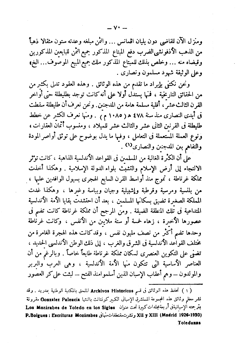 ونحن نكتفى بإيراد ما تقدم من هذه الوثائق. وهذه العقود تدلى بكثير من الحقائق التاريخية، فمنها يستدل أولا على أنه كانت توجد بطليطلة حتى أواخر القرن الثالث عشر، أقلية مسلمة هامة من المدجنين. ونحن نعرف أن طليطلة سقطت فى أيدى النصارى منذ سنة 478 هـ (1085 م). ومنها نعرف الكثير عن خطط طليطلة فى القرنين الثانى عشر والثالث عشر للميلاد، ومنسوب أثمان العقارات، ونوع العملة المستعملة فى التعامل، وفيها ما يدل بوضوح على توثق أواصر المودة والتفاهم بين المدجنين والنصارى (¬1).