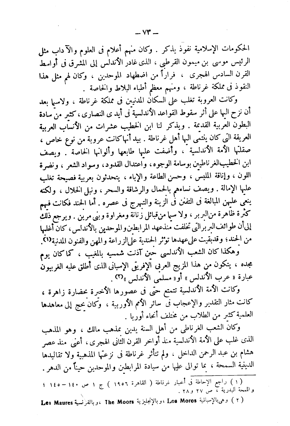 وهكذا كان الشعب الأندلسى حين آذنت شمسه بالمغيب، كما كان يوم مجده، يتكون من هذا المزيج العربى الإفريقى الإسبانى الذى أطلق عليه الغربيون عبارة "عرب الأندلس" أو "مسلمى الأندلس" (¬2).