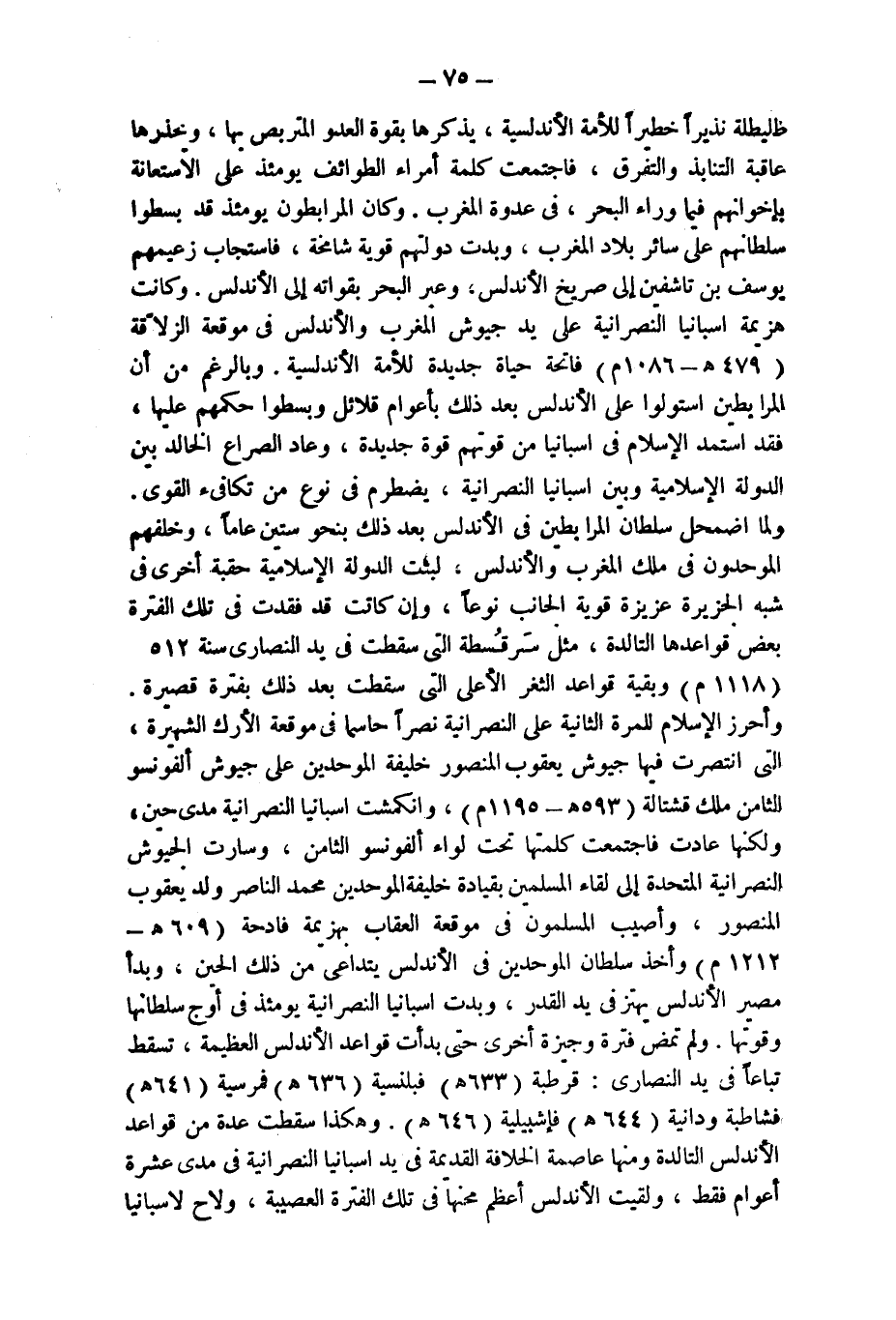 طليطلة نذيراً خطيراً للأمة الأندلسية، يذكرها بقوة العدو المتربص بها، ويحذرها عاقبة التنابذ والتفرق، فاجتمعت كلمة أمراء الطوائف يومئذ على الاستعانة بإخوانهم فيما وراء البحر، فى عدوة المغرب. وكان المرابطون يومئذ قد بسطوا سلطانهم على سائر بلاد المغرب، وبدت دولتهم قوية شامخة، فاستجاب زعيمهم يوسف بن تاشفين إلى صريخ الأندلس. وعبر البحر بقواته إلى الأندلس. وكانت هزيمة اسبانيا النصرانية على يد جيوش المغرب والأندلس فى موقعة الزلاّقة (479 هـ - 1086 م) فاتحة حياة جديدة للأمة الأندلسية. وبالرغم من أن المرابطين استولوا على الأندلس بعد ذلك بأعوام قلائل وبسطوا حكمهم عليها، فقد استمد الإسلام فى اسبانيا من قوتهم قوة جديدة، وعاد الصراع الخالد بين الدولة الإسلامية وبين اسبانيا النصرانية، يضطرم فى نوع من تكافىء القوى. ولما اضمحل سلطان المرابطين فى الأندلس بعد ذلك بنحو ستين عاماً، وخلفهم الموحدون فى ملك المغرب والأندلس، لبثت الدولة الإسلامية حقبة أخرى فى شبه الجزيرة عزيزة قوية الجانب نوعاً، وإن كانت قد فقدت فى تلك الفترة بعض قواعدها التالدة، مثل سَرقُسطة التى سقطت فى يد النصارى سنة 512 هـ (1118 م) وبقية قواعد الثغر الأعلى التى سقطت بعد ذلك بفترة قصيرة. وأحرز الإسلام للمرة الثانية على النصرانية نصراً حاسما فى موقعة الأرك الشهيرة، التى انتصرت فيها جيوش يعقوب المنصور خليفة الموحدين على جيوش ألفونسو الثامن ملك قشتالة (593 هـ - 1195 م)، وانكمشت اسبانيا النصرانية مدى حين، ولكنها عادت فاجتمعت كلمتها تحت لواء ألفونسو الثامن، وسارت الجيوش النصرانية المتحدة إلى لقاء المسلمين بقيادة خليفة الموحدين محمد الناصر ولد يعقوب المنصور، وأصيب المسلمون فى موقعة العقاب بهزيمة فادحة (609 هـ - 1212 م) وأخذ سلطان الموحدين فى الأندلس يتداعى من ذلك الحين، وبدأ مصير الأندلس يهتز فى يد القدر، وبدت اسبانيا النصرانية يومئذ فى أوج سلطانها وقوتها. ولم تمض فترة وجيزة أخرى حتى بدأت قواعد الأندلس العظيمة، تسقط تباعاً فى يد النصارى: قرطبة (633 هـ) فبلنسبة (636 هـ) فمرسية (641 هـ) فشاطبة ودانية (644 هـ) فإشبيلية (646 هـ). وهكذا سقطت عدة من قواعد الأندلس التالدة ومنها عاصمة الخلافة القديمة فى يد اسبانيا النصرانية فى مدى عشرة أعوام فقط، ولقيت الأندلس أعظم محنها فى تلك الفترة العصيبة، ولاح لاسبانيا mmmmmm