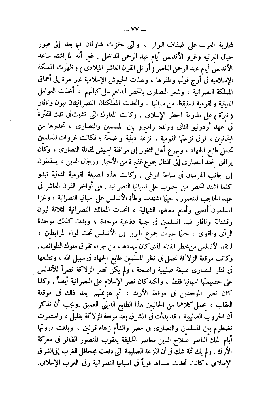 لمحاربة العرب على ضفاف اللوار، والتى حفزت شارلمان فيما بعد إلى عبور جبال البرنيه وغزو الأندلس أيام عبد الرحمن الداخل. غير أنه لما اشتد ساعد الأندلس أيام عبد الرحمن الناصر (أوائل القرن العاشر الميلادى) وظهرت المملكة الإسلامية فى أوج قوتها وظفرها، ونفذت الجيوش الإسلامية غير مرة إلى أعماق المملكة النصرانية، وشعر النصارى بالخطر الداهم على كيانهم، أخذت العوامل الدينية والقومية تستيقظ من سباتها، واتحدت المملكتان النصرانيتان ليون ونافار (نبرّة) على مقاومة الخطر الإسلامى. وكانت المعارك التى نشبت فى تلك الفترة فى عهد أردونيو الثانى وولده راميرو بين المسلمين والنصارى، تحدوها من الجانبين، فوق نزعتها القومية، نزعة دينية واضحة؛ فكانت غزوات المسلمين تحمل طابع الجهاد، ويهرع أهل الثغور إلى مرافقة الجيش لمقاتلة النصارى، وكان يرافق الجند النصارى إلى القتال جموع غفيرة من الأحبار ورجال الدين، يسقطون إلى جانب الفرسان فى ساحة الوغى. وكانت هذه الصبغة القومية الدينية تبدو كلما اشتد الخطر من الجنوب على اسبانيا النصرانية. ففى أواخر القرن العاشر فى عهد الحاجب المنصور، حينما اشتدت وطأة الأندلس على اسبانيا النصرانية، وغزا المسلمون أقصى وأمنع معاقلها الشمالية، اتحدت الممالك النصراية الثلاثة ليون وقشتالة ونافار ضد المسلمين فى جبهة دفاعية موحدة؛ وبدت كذلك موحدة الرأى والقوى، حينما عبرت جموع البربر إلى الأندلس تحت لواء المرابطين، لتنقذ الأندلس من خطر الفناء الذى كان يهددها، من جراء تفوق ملوك الطوائف. وكانت موقعة الزلاّقة تحمل فى نظر المسلمين طابع الجهاد فى سبيل الله، وتطبعها فى نظر النصارى صبغة صليبية واضحة، ولم يكن نصر الزلاّقة نصراً للأندلس على خصيمتها اسبانيا فقط، ولكنه كان نصر الإسلام على النصرانية أيضاً. وكذا كان نصر الموحدين فى موقعة الأرك، ثم هزيمتهم بعد ذلك فى موقعة العقاب، يحمل كلاهما من الجانبين هذا الطابع الدينى العميق. ويجب أن نذكر أن الحروب الصليبية، قد بدأت فى المشرق بعد موقعة الزلاّقة بقليل، واستمرت تضطرم بين المسلمين والنصارى فى مصر والشام زهاء قرنين، وبلغت ذروتها أيام الملك الناصر صلاح الدين معاصر الخليفة يعقوب المنصور الظافر فى معركة الأرك. ولم يك ثمة شك فى أن النزعة الصليبية التى دفعت بجحافل الغرب إلى الشرق الإسلامى، كانت تحدث صداها قوياً فى اسبانيا النصرانية وفى الغرب الإسلامى.