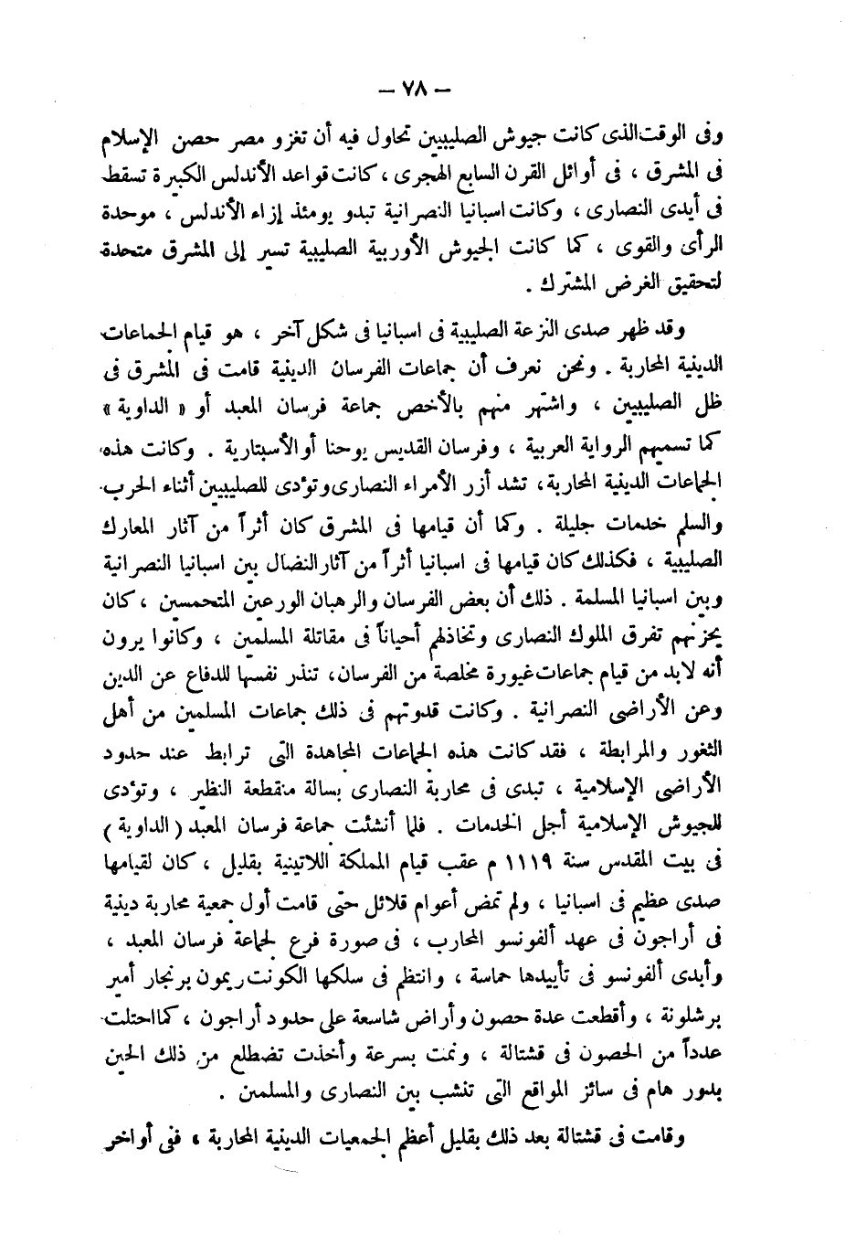 وقد ظهر صدى النزعة الصليبية فى اسبانيا فى شكل آخر، هو قيام الجماعات الدينية المحاربة. ونحن نعرف أن جماعات الفرسان الدينية قامت فى المشرق فى ظل الصليبيين، واشتهر منهم بالأخص جماعة فرسان المعبد أو "الداوية" كما تسميهم الرواية العربية، وفرسان القديس يوحنا أوالأسبتارية. وكانت هذه الجماعات الدينية المحاربة، تشد أزر الأمراء النصارى وتؤدى للصليبيين أثناء الحرب والسلم خدمات جليلة. وكما أن قيامها فى المشرق كان أثراً من آثار المعارك الصليبية، فكذلك كان قيامها فى اسبانيا أثراً من آثار النضال بين اسبانيا النصرانية وبين اسبانيا المسلمة. ذلك أن بعض الفرسان والرهبان الورعين المتحمسين، كان يحزنهم تفرق الملوك النصارى وتخاذلهم أحياناً فى مقاتلة المسلمين، وكانوا يرون أنه لابد من قيام جماعات غيورة مخلصة من الفرسان، تنذر نفسها للدفاع عن الدين وعن الأراضى النصرانية. وكانت قدوتهم فى ذلك جماعات المسلمين من أهل الثغور والمرابطة، فقد كانت هذه الجماعات المجاهدة التى ترابط عند حدود الأراضى الإسلامية، تبدى فى محاربة النصارى بسالة منقطعة النظير، وتؤدى للجيوش الإسلامية أجلّ الخدمات. فلما أنشئت جماعة فرسان المعبد (الداوية) فى بيت المقدس سنة 1119 م عقب قيام المملكة اللاتينية بقليل، كان لقيامها صدى عظيم فى اسبانيا، ولم تمض أعوام قلائل حتى قامت أول جمعية محاربة دينية فى أراجون فى عهد ألفونسو المحارب، فى صورة فرع لجماعة فرسان المعبد، وأبدى ألفونسو فى تأييدها حماسة، وانتظم فى سلكها الكونت ريمون برنجار أمير برشلونة، وأقطعت عدة حصون وأراض شاسعة على حدود أراجون، كما احتلت عدداً من الحصون فى قشتالة، ونمت بسرعة وأخذت تضطلع من ذلك الحين بدور هام فى سائر المواقع التى تنشب بين النصارى والمسلمين.