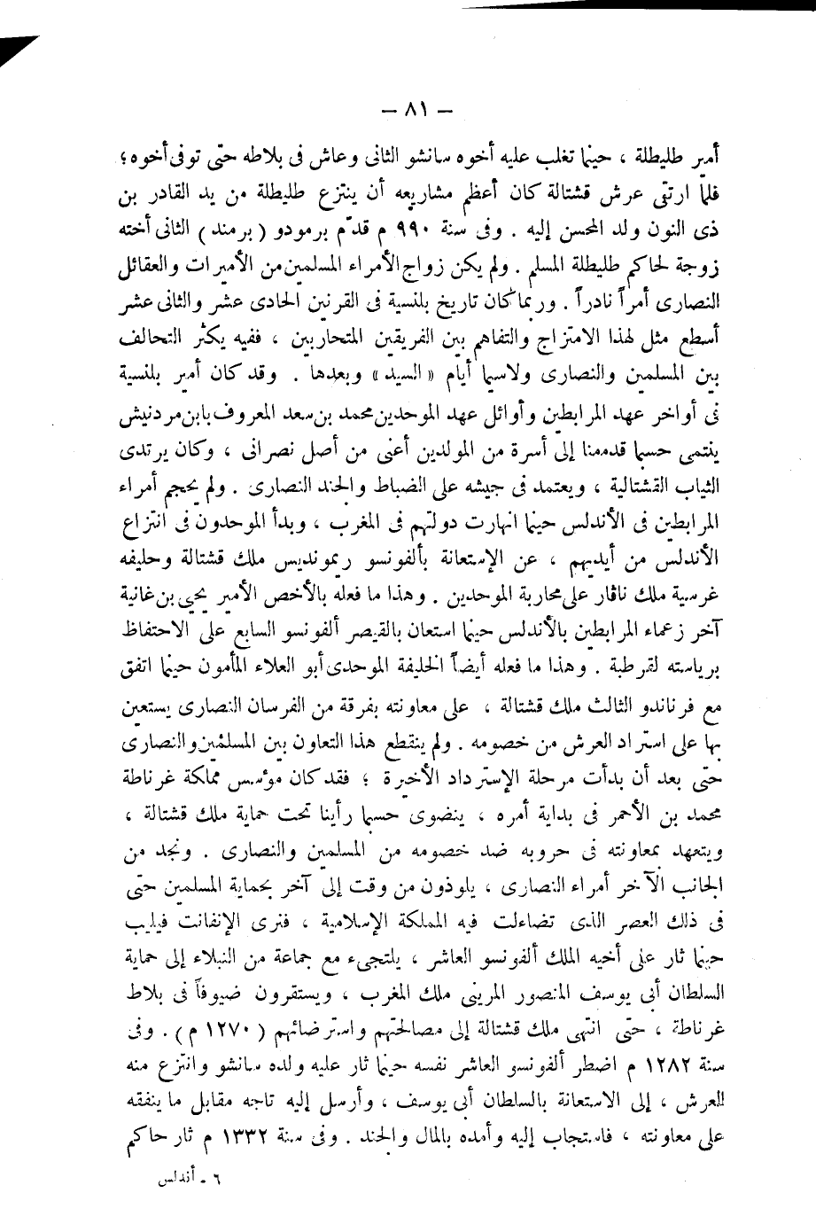 أمير طليطلة، حينما تغلب عليه أخوه سانشو الثانى وعاش فى بلاطه حتى توفى أخوه؛ فلما ارتقى عرش قشتالة كان أعظم مشاريعه أن ينتزع طليطلة من يد القادر بن ذى النون ولد المحسن إليه. وفى سنة 990 م قدّم برمودو (برمند) الثانى أخته زوجة لحاكم طليطلة المسلم. ولم يكن زواج الأمراء المسلمين من الأميرات والعقائل النصارى أمراً نادراً. وربما كان تاريخ بلنسية فى القرنين الحادى عشر والثانى عشر أسطع مثل لهذا الامتزاج والتفاهم بين الفريقين المتحاربين، ففيه يكثر التحالف بين المسلمين والنصارى ولاسيما أيام "السيد" وبعدها. وقد كان أمير بلنسية فى أواخر عهد المرابطين وأوائل عهد الموحدين محمد بن سعد المعروف بابن مردنيش ينتمى حسبما قدّمنا إلى أسرة من المولدين أعنى من أصل نصرانى، وكان يرتدى الثياب القشتالية، ويعتمد فى جيشه على الضباط والجند النصارى. ولم يحجم أمراء المرابطين فى الأندلس حينما انهارت دولتهم فى المغرب، وبدأ الموحدون فى انتزاع الأندلس من أيديهم، عن الإستعانة بألفونسو ريمونديس ملك قشتالة وحليفه غرسية ملك نافار على محاربة الموحدين. وهذا ما فعله بالأخص الأمير يحيى بن غانية آخر زعماء المرابطين بالأندلس حينما استعان بالقيصر ألفونسو السابع على الاحتفاظ برياسته لقرطبة. وهذا ما فعله أيضاً الخليفة الموحدى أبو العلاء المأمون حينما اتفق مع فرناندو الثالث ملك قشتالة، على معاونته بفرقة من الفرسان النصارى يستعين بها على استرداد العرش من خصومه. ولم ينقطع هذا التعاون بين المسلمين والنصارى حتى بعد أن بدأت مرحلة الإسترداد الأخيرة؛ فقد كان مؤسس مملكة غرناطة محمد بن الأحمر فى بداية أمره، ينضوى حسبما رأينا تحت حماية ملك قشتالة، ويتعهد بمعاونته فى حروبه ضد خصومه من المسلمين والنصارى. ونجد من الجانب الآخر أمراء النصارى، يلوذون من وقت إلى آخر بحماية المسلمين حتى فى ذلك العصر الذى تضاءلت فيه المملكة الإسلامية، فنرى الإنفانت فيلب حينما ثار على أخيه الملك ألفونسو العاشر، يلتجىء مع جماعة من النبلاء إلى حماية السلطان أبى يوسف المنصور المرينى ملك المغرب، ويستقرون ضيوفاً فى بلاط غرناطة، حتى انتهى ملك قشتالة إلى مصالحتهم واسترضائهم (1270 م). وفى سنة 1282 م اضطر ألفونسو العاشر نفسه حينما ثار عليه ولده سانشو وانتزع منه العرش، إلى الاستعانة بالسلطان أبى يوسف، وأرسل إليه تاجه مقابل ما ينفقه على معاونته، فاستجاب إليه وأمده بالمال والجند. وفى سنة 1332 م ثار حاكم