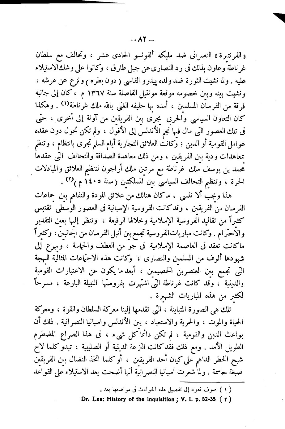 " الفرنتيرة " النصرانى ضد مليكه ألفونسو الحادى عشر، وتحالف مع سلطان غرناطة وعاون بذلك فى رد النصارى عن جبل طارق، وكانوا على وشك الاستيلاء عليه. ولما نشبت الثورة ضد ولده بيدرو القاسى (دون بطره) ونزع عن عرشه، ونشبت بينه وبين خصومه موقعة مونتيل الفاصلة لسنة 1367 م، كان إلى جانبه فرقة من الفرسان المسلمين، أمده بها حليفه الغنى بالله ملك غرناطة (¬1). وهكذا كان التعاون السياسى والحربى يجرى بين الفريقين من آونة إلى أخرى، حتى فى تلك العصور التى مال فيها نجم الأندلس إلى الأفول، ولم تكن تحول دون عقده عوامل القومية أو الدين؛ وكانت العلائق التجارية أيام السلم تجرى بانتظام، وتنظم بمعاهدات ودية بين الفريقين، ومن ذلك معاهدة الصداقة والتحالف التى عقدها محمد بن يوسف ملك غرناطة مع مرتين ملك أراجون لتنظيم العلائق والمبادلات الحرة، وتنظيم التحالف السياسى بين المملكتين (سنة 1405 م) (¬2).