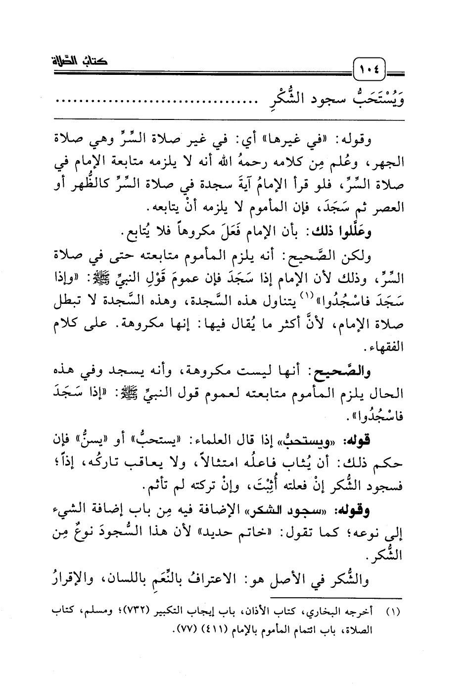 وقوله: «سجود الشكر» الإضافة فيه مِن باب إضافة الشيء إلى نوعه؛ كما تقول: «خاتم حديد» لأن هذا السُّجودَ نوعٌ مِن الشُّكر.