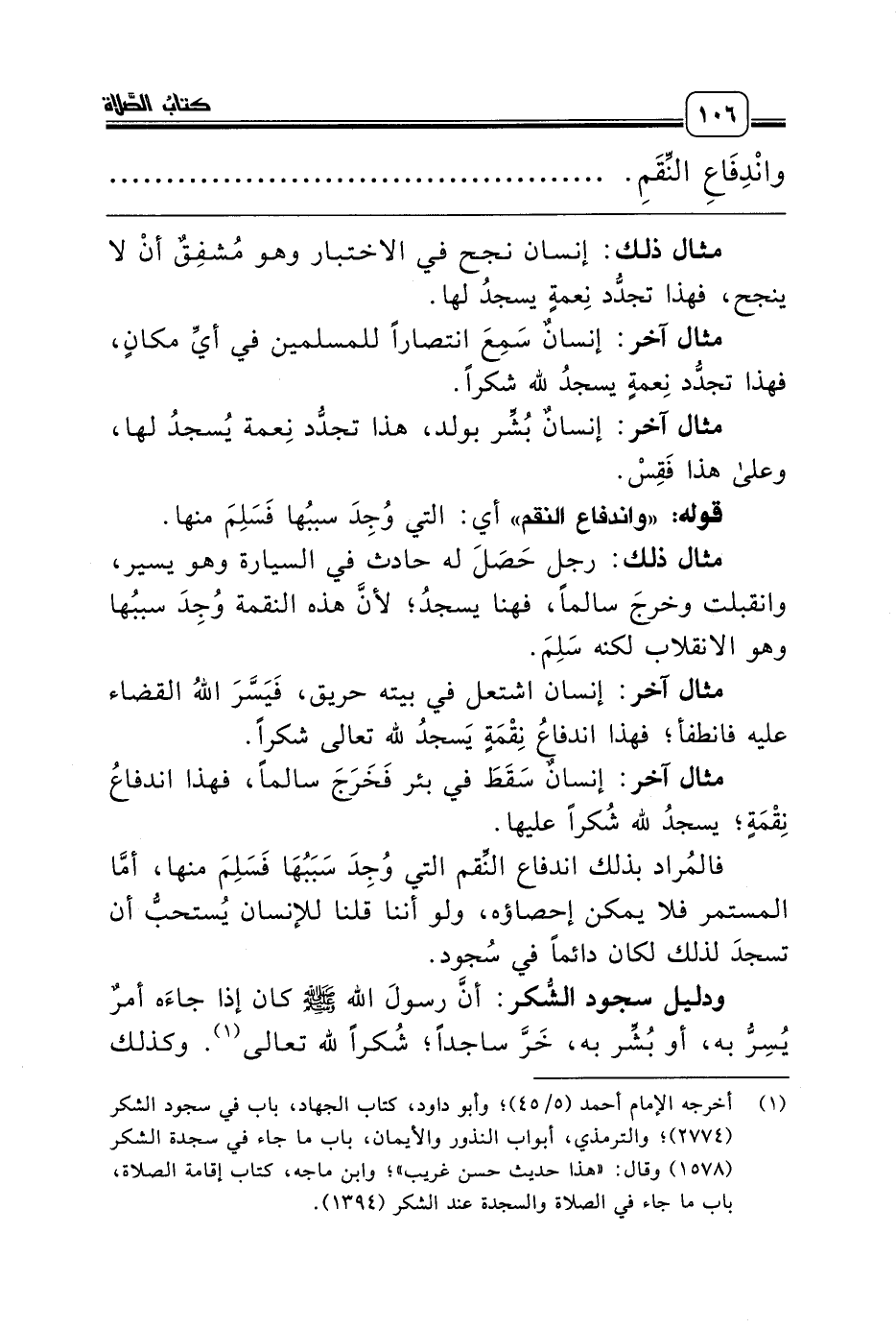 مثال آخر: إنسانٌ سَقَطَ في بئر فَخَرَجَ سالماً، فهذا اندفاعُ نِقْمَةٍ؛ يسجدُ لله شُكراً عليها.