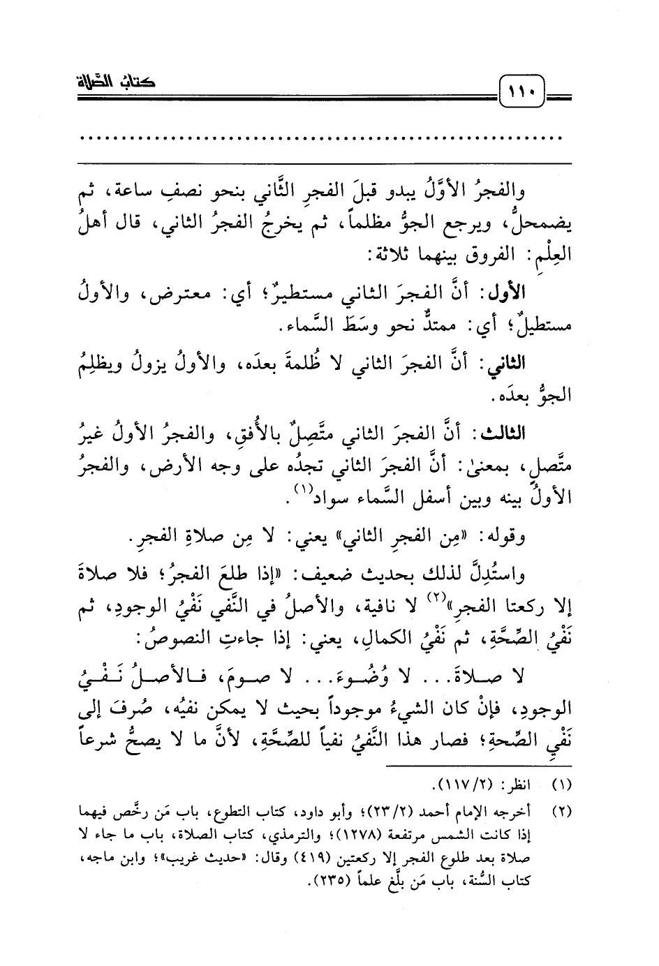 والفجرُ الأوَّلُ يبدو قبلَ الفجرِ الثَّاني بنحو نصفِ ساعة، ثم يضمحلُّ، ويرجع الجوُّ مظلماً، ثم يخرجُ الفجرُ الثاني، قال أهلُ العِلْمِ: الفروق بينهما ثلاثة: