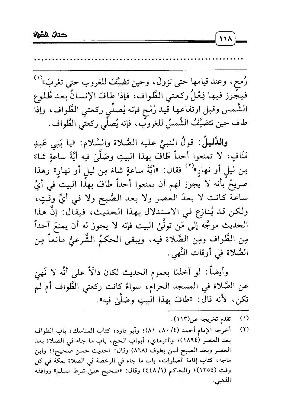 والدَّليلُ: قولُ النبيِّ عليه الصَّلاة والسَّلام: «يا بَنِي عَبدِ مَنَافٍ، لا تمنعوا أحداً طَافَ بهذا البيتِ وصَلَّى فيه أيَّةَ ساعةٍ شاءَ مِن ليلٍ أو نهارٍ» (¬2) فقال: «أيَّةَ ساعةٍ شاءَ مِن ليلٍ أو نهارٍ» وهذا صريحٌ بأنه لا يجوز لهم أن يمنعوا أحداً طافَ بهذا البيت في أيِّ ساعة كانت لا بعدَ العصر ولا بعد الصُّبح ولا في أيِّ وقتٍ، ولكن قد يُنازع في الاستدلال بهذا الحديث، فيقال: إنَّ هذا الحديث موجَّه إلى مَن تولَّى البيت فإنه لا يجوز له أن يمنعَ أحداً مِن الطَّواف ومِن الصَّلاة فيه، ويبقى الحكمُ الشَّرعيُّ مانعاً مِن الصَّلاة في أوقات النَّهي.