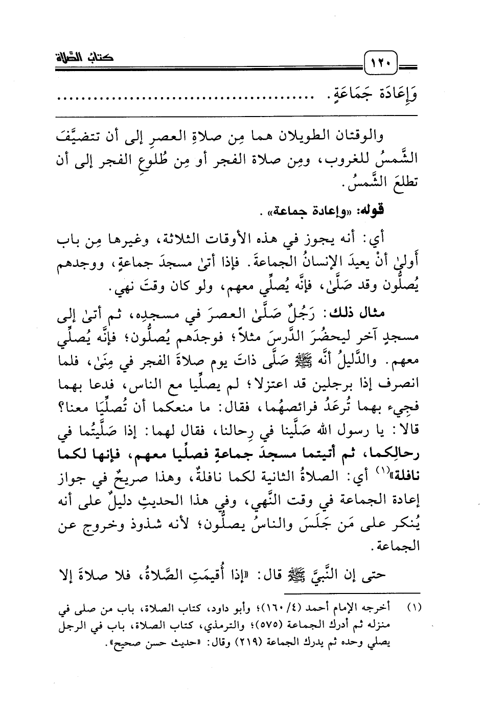 مثال ذلك: رَجُلٌ صَلَّى العصرَ في مسجدِه، ثم أتى إلى مسجدٍ آخر ليحضُرَ الدَّرسَ مثلاً؛ فوجدَهم يُصلُّون؛ فإنَّه يُصلِّي معهم. والدَّليلُ أنَّه صلّى الله عليه وسلّم صَلَّى ذاتَ يوم صلاةَ الفجر في مِنَى، فلما انصرف إذا برجلين قد اعتزلا؛ لم يصلِّيا مع الناس، فدعا بهما فجِيء بهما تُرعَدُ فرائصهُما، فقال: ما منعكما أن تُصلِّيَا معنا؟ قالا: يا رسول الله صَلَّينا في رِحالنا، فقال لهما: إذا صَلَّيتُما في رحالِكما، ثم أتيتما مسجدَ جماعةٍ فصلِّيا معهم، فإنها لكما نافلة» (¬1) أي: الصلاةُ الثانية لكما نافلةٌ، وهذا صريحٌ في جواز إعادة الجماعة في وقت النَّهي، وفي هذا الحديثِ دليلٌ على أنه يُنكر على مَن جَلَسَ والناسُ يصلُّون؛ لأنه شذوذ وخروج عن الجماعة.