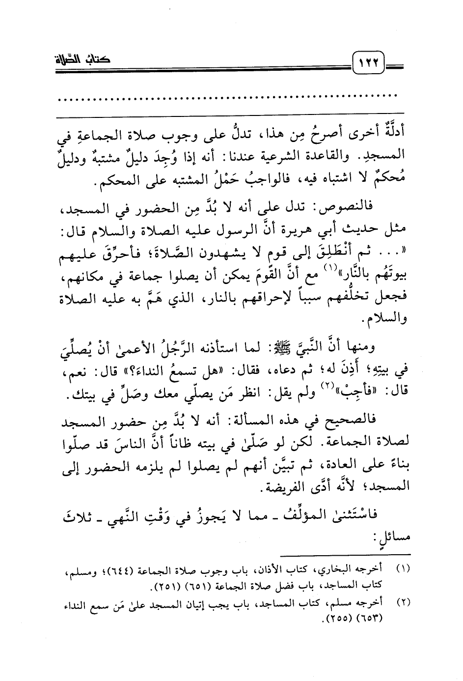 أدلَّةٌ أخرى أصرحُ مِن هذا، تدلُّ على وجوب صلاة الجماعةِ في المسجدِ. والقاعدة الشرعية عندنا: أنه إذا وُجِدَ دليلٌ مشتبهٌ ودليلٌ مُحكمٌ لا اشتباه فيه، فالواجبُ حَمْلُ المشتبه على المحكم.