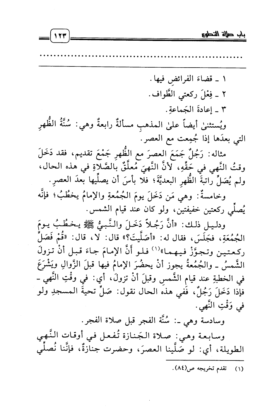 وسابعة وهي: صلاة الجَنازة تُفعل في أوقات النَّهي الطويلة، أي: لو صَلَّينا العصرَ، وحضرت جنازةٌ، فإنَّنا نُصلِّي