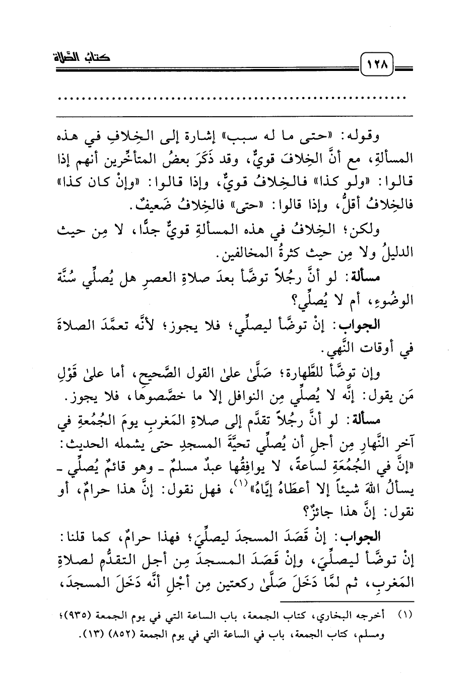 مسألة: لو أنَّ رجُلاً تقدَّم إلى صلاةِ المَغربِ يومَ الجُمُعةِ في آخر النَّهارِ مِن أجلِ أن يُصلِّي تحيَّةَ المسجدِ حتى يشمله الحديث: «إنَّ في الجُمُعَةِ لساعةً، لا يوافِقُها عبدٌ مسلمٌ ـ وهو قائمٌ يُصلِّي ـ يسألُ اللهَ شيئاً إلا أعطَاهُ إيَّاهُ» (¬1)، فهل نقول: إنَّ هذا حرامٌ، أو نقول: إنَّ هذا جائزٌ؟