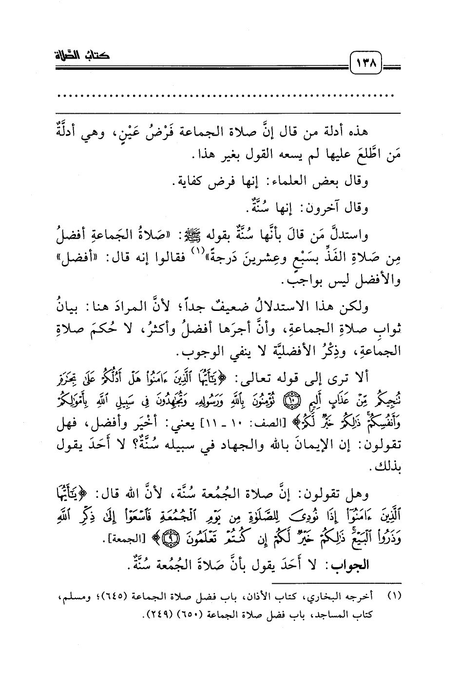 وهل تقولون: إنَّ صلاة الجُمُعة سُنَّة، لأنَّ الله قال: {يَاأَيُّهَا الَّذِينَ آمَنُوا إِذَا نُودِيَ لِلصَّلاَةِ مِنْ يَوْمِ الْجُمُعَةِ فَاسْعَوْا إِلَى ذِكْرِ اللَّهِ وَذَرُوا الْبَيْعَ ذَلِكُمْ خَيْرٌ لَكُمْ إِنْ كُنْتُمْ تَعْلَمُونَ *} [الجمعة].