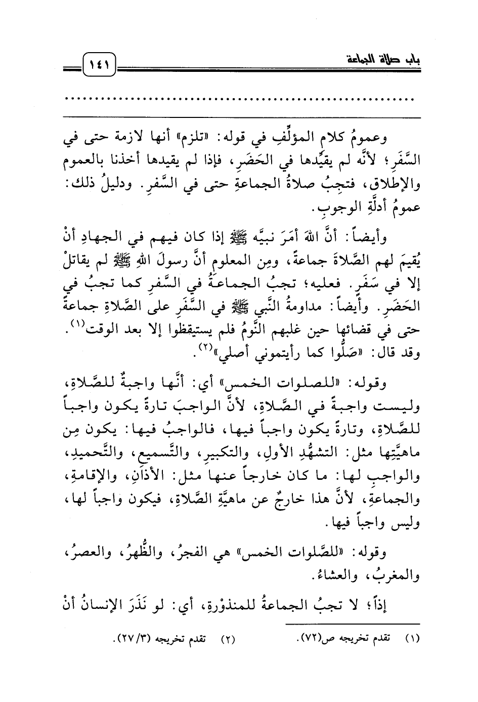 وأيضاً: أنَّ اللهَ أمَرَ نبيَّه صلّى الله عليه وسلّم إذا كان فيهم في الجهادِ أنْ يُقيمَ لهم الصَّلاةَ جماعةً، ومِن المعلومِ أنَّ رسولَ اللهِ صلّى الله عليه وسلّم لم يقاتلْ إلا في سَفَرٍ. فعليه؛ تجبُ الجماعةُ في السَّفرِ كما تجبُ في الحَضَرِ. وأيضاً: مداومةُ النَّبي صلّى الله عليه وسلّم في السَّفَرِ على الصَّلاةِ جماعةً حتى في قضائها حين غلبهم النَّومُ فلم يستيقظوا إلا بعد الوقت (¬1). وقد قال: «صَلُّوا كما رأيتموني أصلي» (¬2).