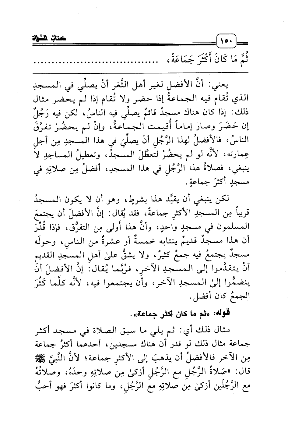 مثال ذلك أي: ثم يلي ما سبق الصلاة في مسجد أكثر جماعة مثال ذلك لو قدر أن هناك مسجدين، أحدهما أكثرُ جماعة مِن الآخر فالأفضلُ أن يذهبَ إلى الأكثرِ جماعة؛ لأنَّ النَّبيَّ صلّى الله عليه وسلّم قال: «صَلاةُ الرَّجُلِ مع الرَّجُلِ أزكى مِن صلاتِهِ وحدَهُ، وصلاتُهُ مع الرَّجُلَين أزكى مِن صلاتِهِ مع الرَّجُلِ، وما كانوا أكثرَ فهو أحبُّ