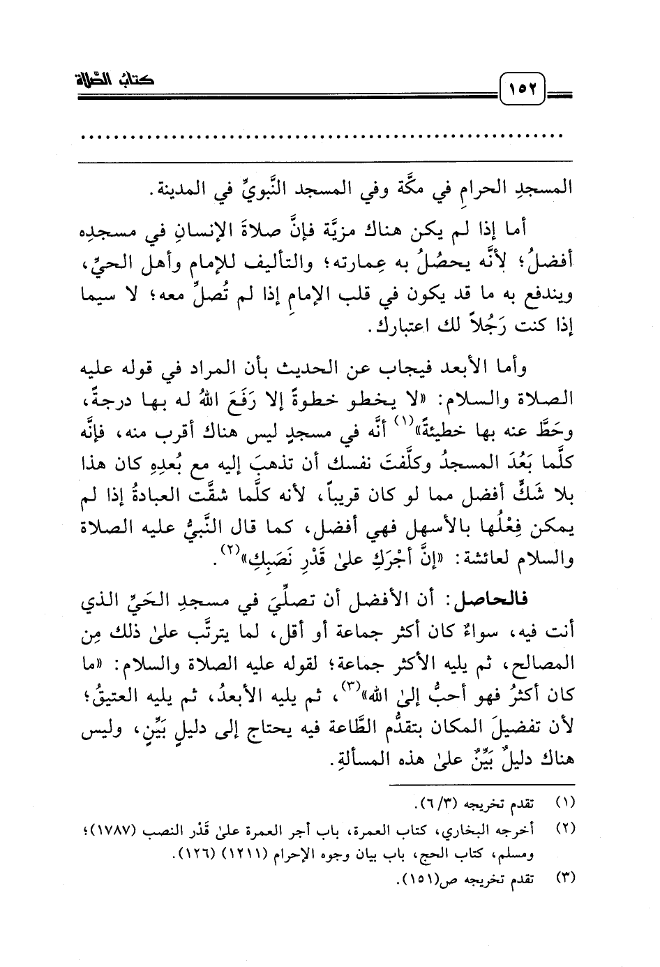 فالحاصل: أن الأفضل أن تصلِّيَ في مسجدِ الحَيِّ الذي أنت فيه، سواءٌ كان أكثر جماعة أو أقل، لما يترتَّب على ذلك مِن المصالح، ثم يليه الأكثر جماعة؛ لقوله عليه الصلاة والسلام: «ما كان أكثرُ فهو أحبُّ إلى الله» (¬3)، ثم يليه الأبعدُ، ثم يليه العتيقُ؛ لأن تفضيلَ المكان بتقدُّم الطَّاعة فيه يحتاج إلى دليلٍ بَيِّنٍ، وليس هناك دليلٌ بَيِّنٌ على هذه المسألةِ.