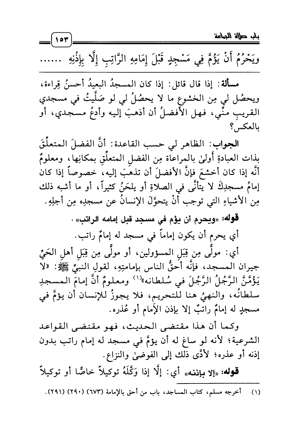ويَحْرُمُ أَنْ يَؤُمَّ فِي مَسْجِدٍ قَبْلَ إِمَامِهِ الرَّاتِبِ إِلاَّ بِإِذْنِهِ أَوْ عُذْرِهِ .......