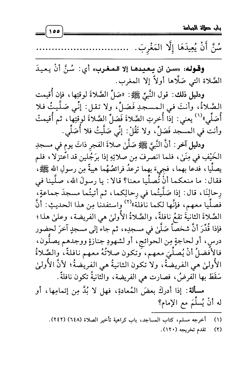 وقوله: «سن أن يعيدها إلا المغرب» أي: سُنَّ أنْ يعيدَ الصَّلاة التي صَلاَّها أولاً إلا المغرب.