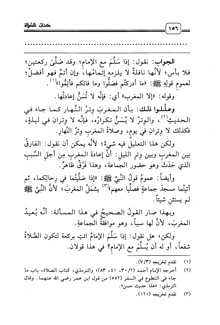 ولكن هذا التعليل فيه شيءٌ؛ لأنَّه يمكن أن نقول: الفارقُ بين المغربِ وبين وِترِ الليلِ: أنَّ إعادةَ المغربِ مِن أجلِ السَّببِ الذي حَدَثَ وهو حضور الجماعة، وهذا فَرْقٌ ظاهرٌ.