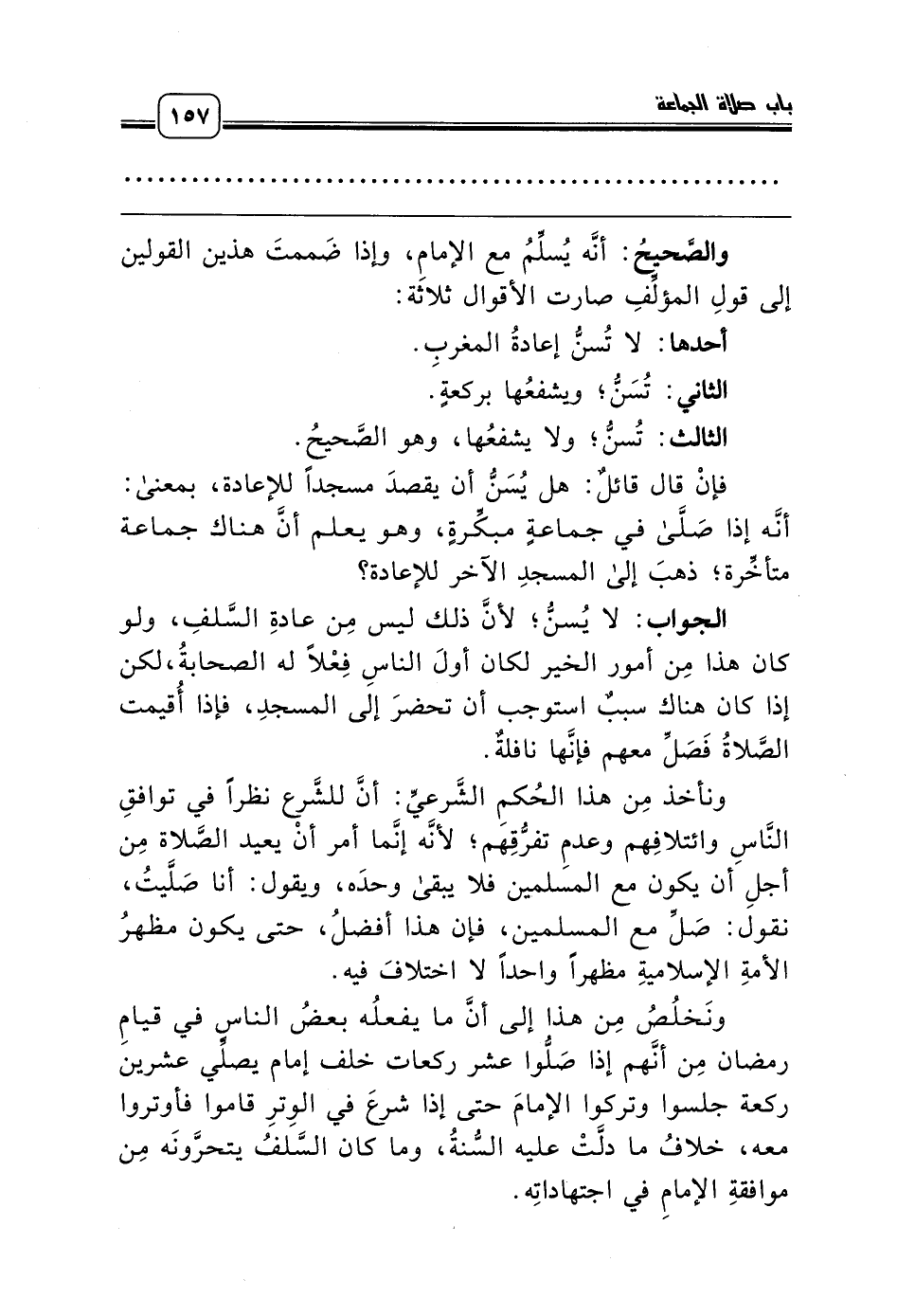 ونَخلُصُ مِن هذا إلى أنَّ ما يفعلُه بعضُ الناسِ في قيامِ رمضان مِن أنَّهم إذا صَلُّوا عشر ركعات خلف إمام يصلِّي عشرين ركعة جلسوا وتركوا الإمامَ حتى إذا شرعَ في الوِترِ قاموا فأوتروا معه، خلافُ ما دلَّتْ عليه السُّنةُ، وما كان السَّلفُ يتحرَّونَه مِن موافقةِ الإمامِ في اجتهاداتِه.