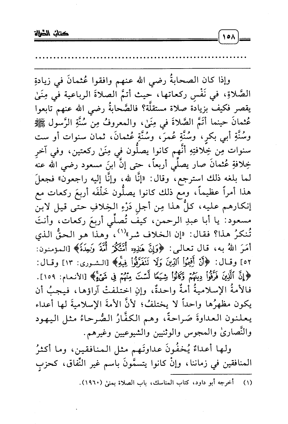 وإذا كان الصحابةُ رضي الله عنهم وافقوا عُثمانَ في زيادةِ الصَّلاةِ، في نَفْسِ ركعاتها، حيث أتمَّ الصلاةَ الرباعية في مِنَى يقصر فكيف بزيادة صلاة مستقلَّة؟ فالصَّحابةُ رضي الله عنهم تابعوا عُثمانَ حينما أتَمَّ الصَّلاةَ في مِنَى، والمعروفُ مِن سُنَّةِ الرَّسول صلّى الله عليه وسلّم وسُنَّةِ أبي بكرٍ، وسُنَّةِ عُمرَ، وسُنَّةِ عُثمانَ، ثمان سنوات أو ست سنوات مِن خِلافتِهِ أنَّهم كانوا يصلُّون في مِنَى ركعتين، وفي آخرِ خِلافةِ عُثمانَ صار يصلِّي أربعاً، حتى إنَّ ابنَ مسعود رضي الله عنه لما بلغه ذلك استرجع، وقال: «إنَّا لله، وإنَّا إليه راجعون» فجعلَ هذا أمراً عظيماً، ومع ذلك كانوا يصلُّون خَلْفَه أربعَ ركعات مع إنكارهم عليه، كلُّ هذا مِن أجلِ دَرْءِ الخِلافِ حتى قيل لابن مسعود: يا أبا عبدِ الرحمن، كيف تُصلِّي أربعَ ركعات، وأنتَ تُنكرُ هذا؟ فقال: «إن الخلاف شر» (¬1)، وهذا هو الحقُّ الذي أمَرَ اللهُ به، قال تعالى: {وَإِنَّ هَذِهِ أُمَّتُكُمْ أُمَّةً وَاحِدَةً} [المؤمنون: 52] وقال: {أَنْ أَقِيمُوا الدِّينَ وَلاَ تَتَفَرَّقُوا فِيهِ} [الشورى: 13] وقال: {إِنَّ الَّذِينَ فَرَّقُوا دِينَهُمْ وَكَانُوا شِيَعًا لَسْتَ مِنْهُمْ فِي شَيْءٍ} [الأنعام: 159]. فالأمةُ الإسلاميةُ أمةٌ واحدةٌ، وإنِ اختلفتْ آراؤها، فيجبُ أن يكون مظهرُها واحداً لا يختلفُ؛ لأنَّ الأمةَ الإسلاميةَ لها أعداء يعلنون العداوةَ صَراحةً، وهم الكفَّارُ الصُّرحاءُ مثل اليهود والنَّصارى والمجوس والوثنيين والشيوعيين وغيرهم.