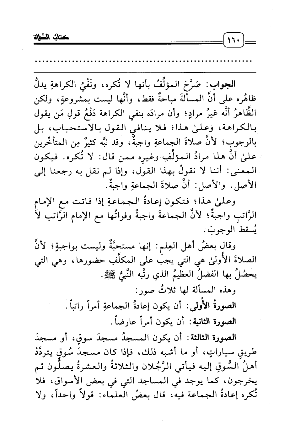 وقال بعضُ أهل العِلمِ: إنها مستحبَّةٌ وليست بواجبةٍ؛ لأنَّ الصلاةَ الأُولى هي التي يجب على المكلَّفِ حضورها، وهي التي يحصُلُ بها الفضلُ العظيمُ الذي رتَّبه النَّبيُّ صلّى الله عليه وسلّم.