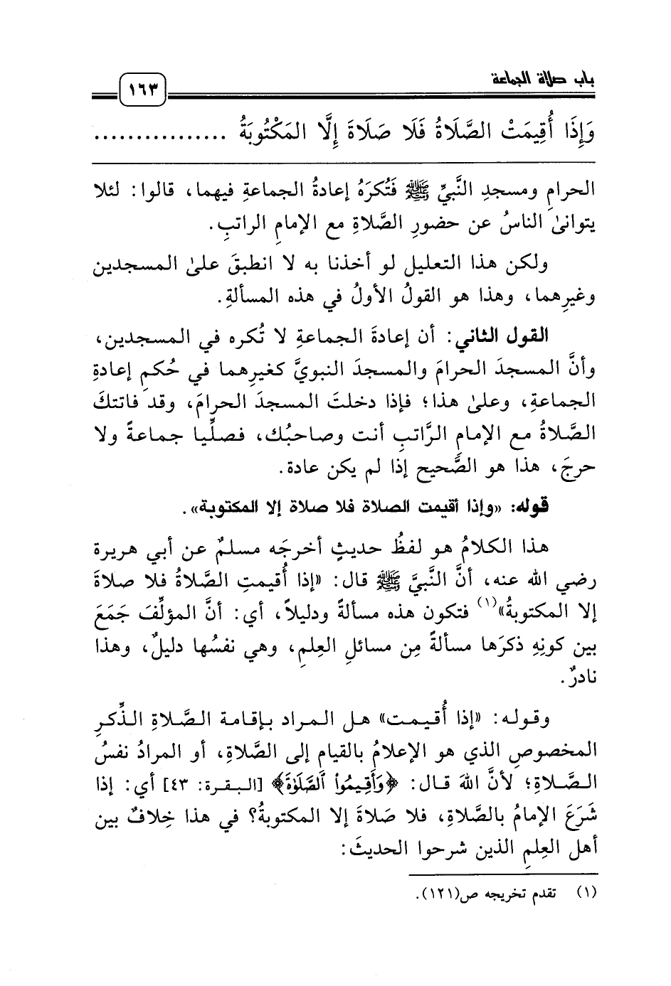 هذا الكلامُ هو لفظُ حديثٍ أخرجَه مسلمٌ عن أبي هريرة رضي الله عنه، أنَّ النَّبيَّ صلّى الله عليه وسلّم قال: «إذا أُقيمتِ الصَّلاةُ فلا صلاةَ إلا المكتوبةُ» (¬1) فتكون هذه مسألةً ودليلاً، أي: أنَّ المؤلِّفَ جَمَعَ بين كونِهِ ذكرَها مسألةً مِن مسائلِ العِلمِ، وهي نفسُها دليلٌ، وهذا نادرٌ.