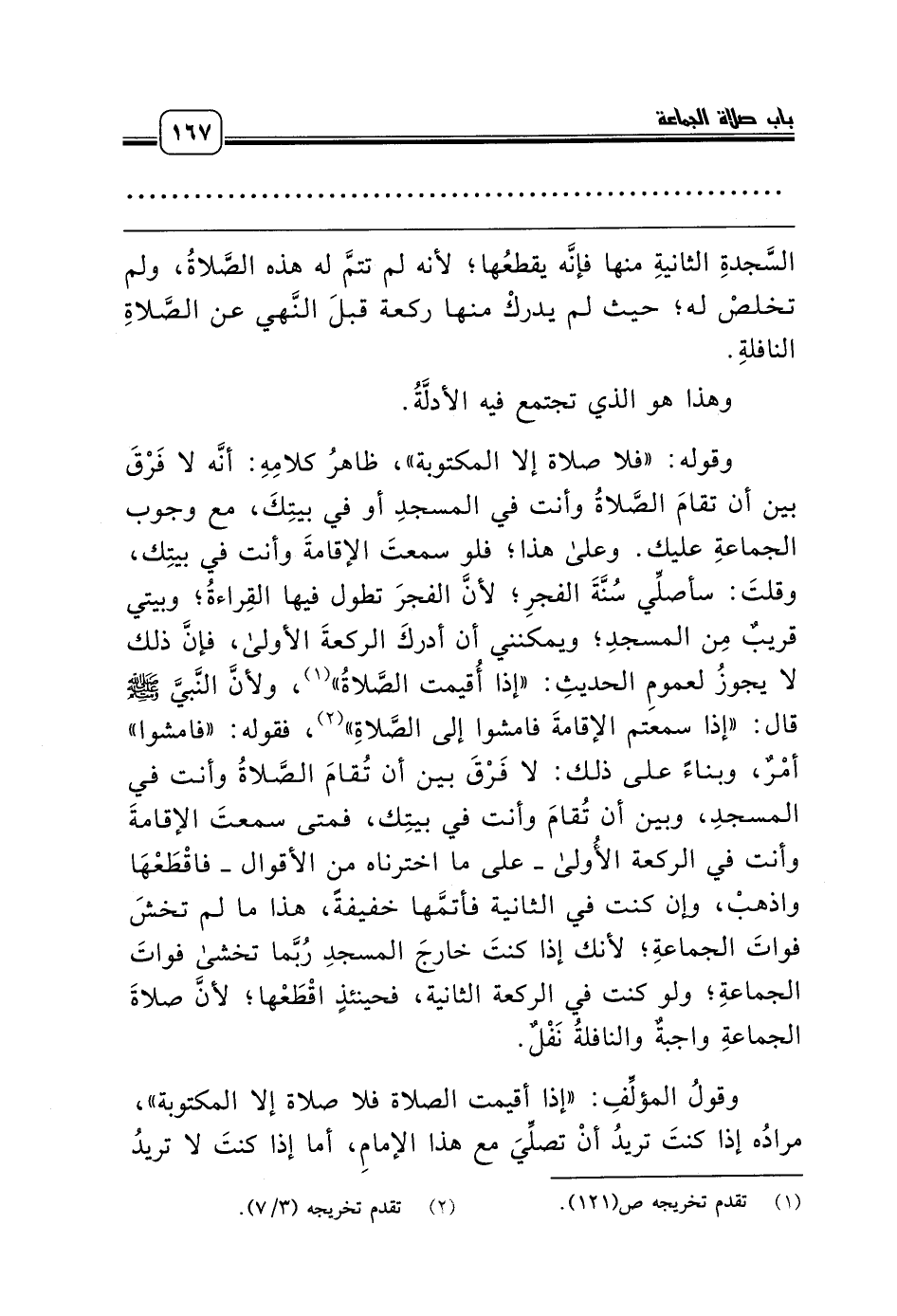وقوله: «فلا صلاة إلا المكتوبة»، ظاهرُ كلامِهِ: أنَّه لا فَرْقَ بين أن تقامَ الصَّلاةُ وأنت في المسجدِ أو في بيتِكَ، مع وجوب الجماعةِ عليك. وعلى هذا؛ فلو سمعتَ الإقامةَ وأنت في بيتِك، وقلتَ: سأصلِّي سُنَّةَ الفجرِ؛ لأنَّ الفجرَ تطول فيها القِراءةُ؛ وبيتي قريبٌ مِن المسجدِ؛ ويمكنني أن أدركَ الركعةَ الأولى، فإنَّ ذلك لا يجوزُ لعمومِ الحديثِ: «إذا أُقيمت الصَّلاةُ» (¬1)، ولأنَّ النَّبيَّ صلّى الله عليه وسلّم قال: «إذا سمعتم الإقامةَ فامشوا إلى الصَّلاةِ» (¬2)، فقوله: «فامشوا» أمْرٌ، وبناءً على ذلك: لا فَرْقَ بين أن تُقامَ الصَّلاةُ وأنت في المسجدِ، وبين أن تُقامَ وأنت في بيتِك، فمتى سمعتَ الإقامةَ وأنت في الركعة الأُولى ـ على ما اخترناه من الأقوال ـ فاقْطَعْهَا واذهبْ، وإن كنت في الثانية فأتمَّها خفيفةً، هذا ما لم تخشَ فواتَ الجماعةِ؛ لأنك إذا كنتَ خارجَ المسجدِ رُبَّما تخشى فواتَ الجماعةِ؛ ولو كنت في الركعة الثانية، فحينئذٍ اقْطَعْها؛ لأنَّ صلاةَ الجماعةِ واجبةٌ والنافلةُ نَفْلٌ.