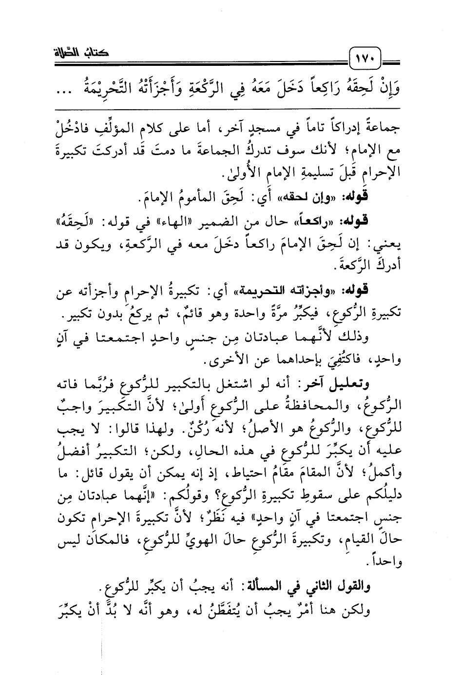 وتعليل آخر: أنه لو اشتغل بالتكبير للرُّكوعِ فرُبَّما فاته الرُّكوعُ، والمحافظةُ على الرُّكوعِ أَولى؛ لأنَّ التكبيرَ واجبٌ للرُّكوعِ، والرُّكوعُ هو الأصلُ؛ لأنه رُكْنٌ. ولهذا قالوا: لا يجب عليه أن يكبِّرَ للرُّكوعِ في هذه الحالِ، ولكن؛ التكبيرُ أفضلُ وأكملُ؛ لأنَّ المقامَ مقامُ احتياط، إذ إنه يمكن أن يقول قائل: ما دليلُكم على سقوطِ تكبيرةِ الرُّكوعِ؟ وقولُكم: «إنَّهما عبادتان مِن جنسٍ اجتمعتا في آنٍ واحدٍ» فيه نَظَرٌ؛ لأنَّ تكبيرةَ الإحرامِ تكون حالَ القيامِ، وتكبيرةَ الرُّكوعِ حالَ الهويِّ للرُّكوعِ، فالمكان ليس واحداً.