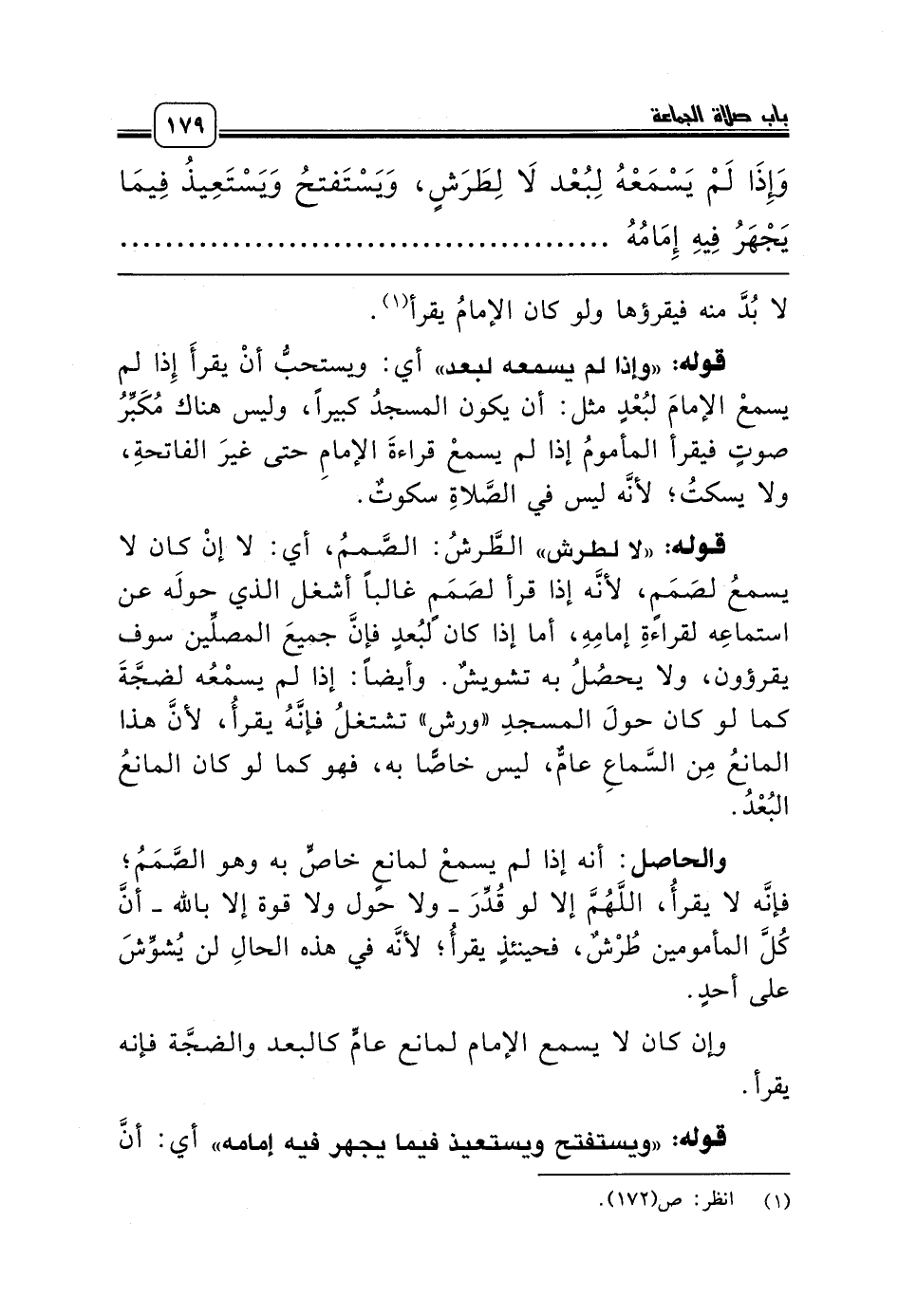 وَإِذَا لَمْ يَسْمَعْهُ لِبُعْد لاَ لِطَرَشٍ، وَيَسْتَفتحُ وَيَسْتَعِيذُ فِيمَا يَجْهَرُ فِيهِ إِمَامُهُ ........